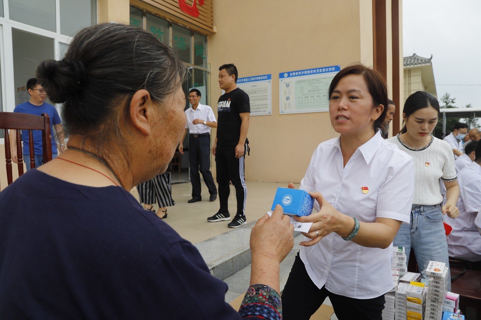 与此同时,我院临床第九党支部书记、大内科副主任兼肝胆病科主任汪静教授,呼吸内科副主任王俊峰教授,临床第四党支部书记、大骨科副主任兼骨伤科(关节·足踝组)副主任汪国友教授,临床第十党支部书记、针灸·康复科主任陈贵全教授,老年病科许志刚主治医师和肿瘤·血液病二科副护士长余朝锈在党群服务中心举行了义诊活动,为前来咨询的村民免费诊断、测量血压、发放药品,并现场进行中医特色治疗。