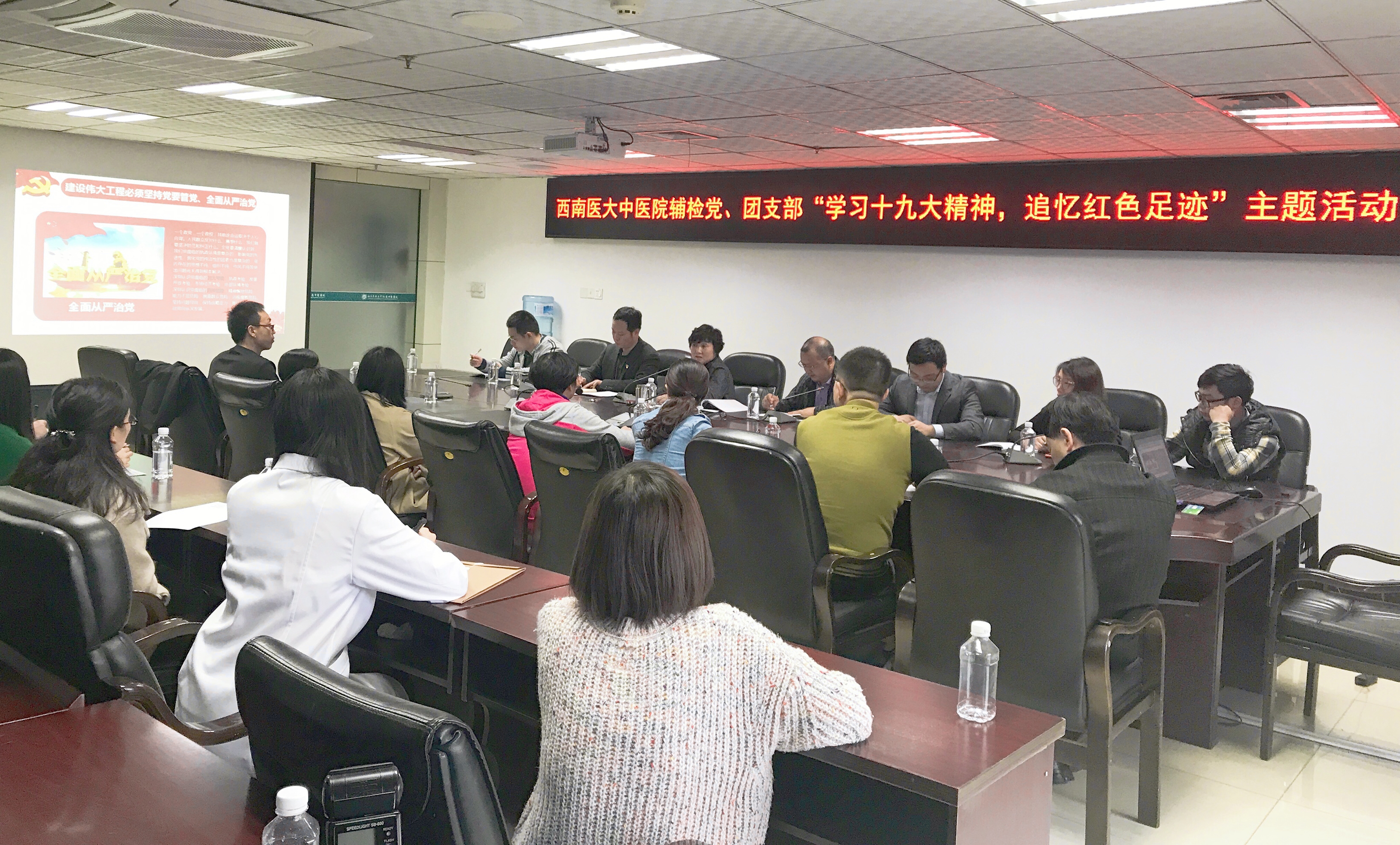 2017年11月18日,西南医科大学附属中医医院辅检党、团支部举行“学习十九大精神,追忆红色足迹”主题党团活动,西南医科大学附属中医医院党委书记王琳,党委副书记•纪委书记赵国强等党政领导及辅检党团支部的党员、团员,民主党派人士,国外友人参加了本次活动。