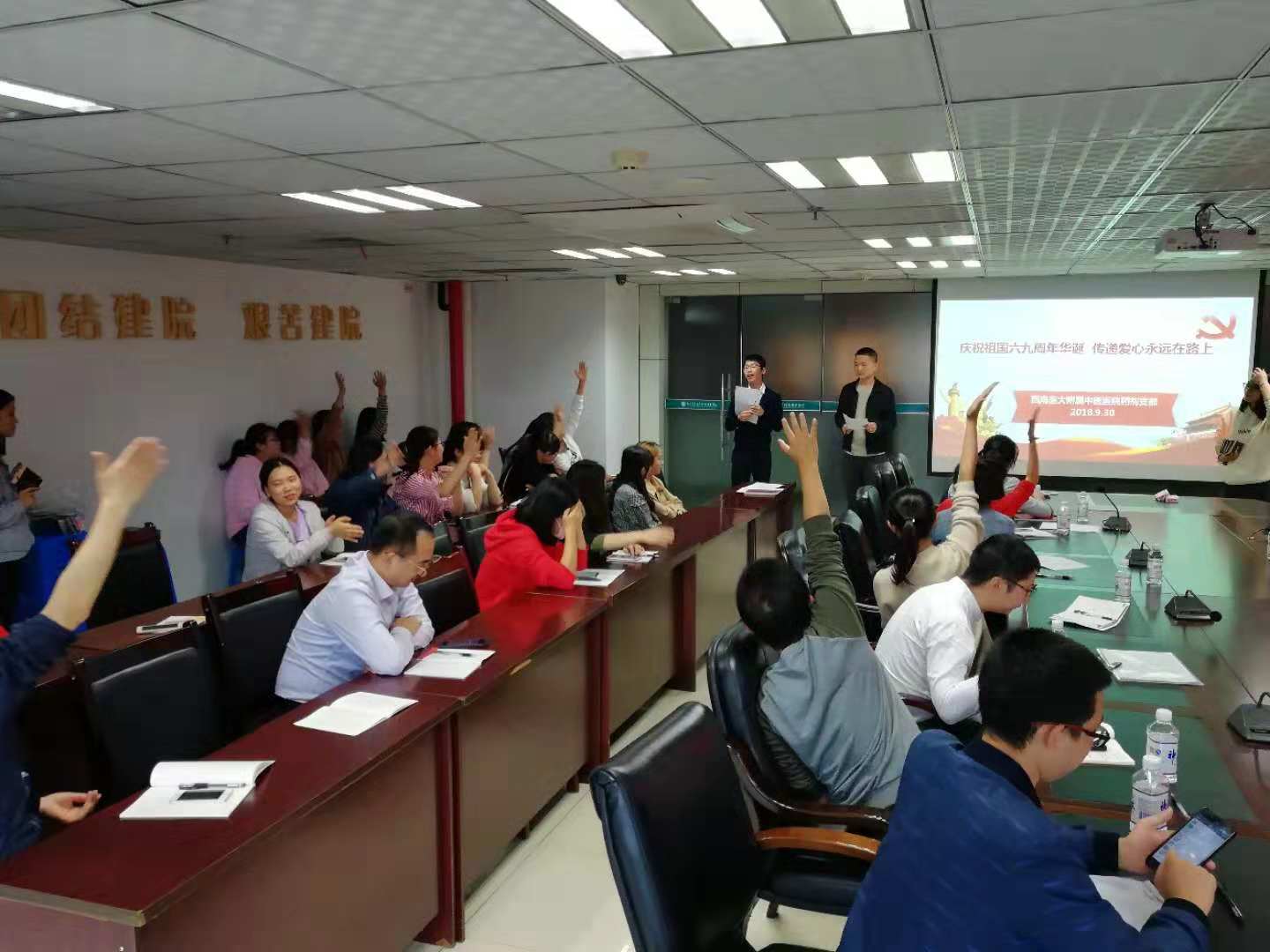 2018年9月30日,我院药剂党支部开展了主题为“庆祝祖国69周年华诞,传递爱心永远在路上”专题活动,党委书记王琳,相关职能部门人员及全体药剂党支部成员参加了活动。