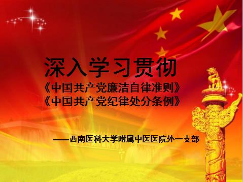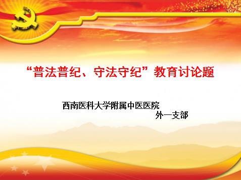 金秋时节,丹桂飘香。2017年9月20日,西西南医科大学附属中医医院外一支部响应上级党委的号召,深入开展了“普法普纪、守法守纪”教育工作,我们外一支部学习了《中国共产党章程》《关于新形势下党内政治生活的若干准则》《中国共产党廉洁自律准则》《中国共产党纪律处分条例》《中国共产党问责条例》《中国共产党党内监督条例》《中医药法》以及加强卫生行业作风建设“九不准”。讨论会以“通过普法普纪、守法守纪教育,有什么体会?”“腐败得来的金钱,能带来幸福和快乐吗?”“怎样做到既一心干事,又一身干净?”“如何做一名知法守法、遵纪守规的中医人?”四个问题为主要议题。我外一支部的党员同志们结合自身生活工作经历、近几年出现的的不正之风畅所欲言。