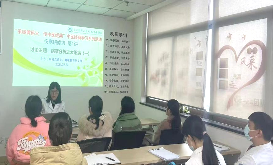 2024年2月29日,我院内科党总支联合继续教育党支部开展了“承岐黄薪火,传中医经典”中医经典学习系列活动——伤寒研修坊(第1讲),医院部分党员、职工及规培学员等参加了会议。会议由内科党总支书记董丽主持。