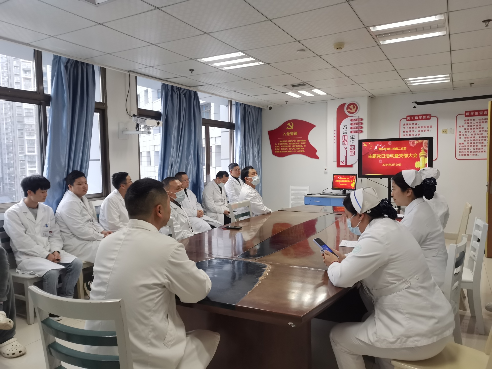 2月29日,骨伤科脊柱·肿瘤二党支部召开党员大会,全体党员以及科室其他医护人员参加了会议。