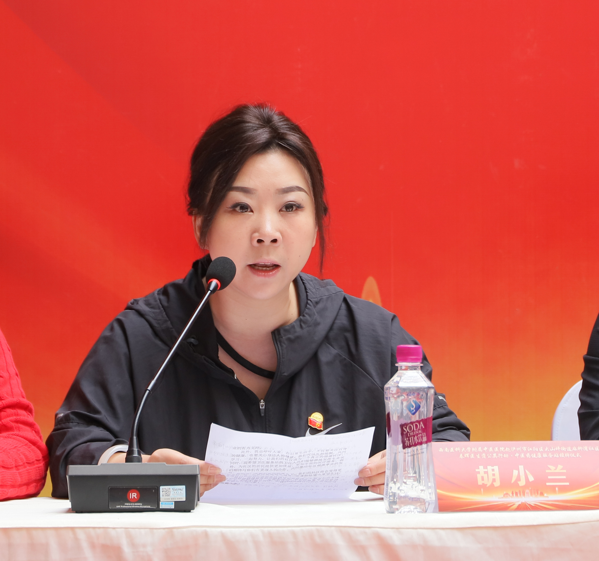 胡小兰讲话,她介绍了麻柳湾社区基本情况,表示将全力配合中医药健康服务站工作,积极组织健康教育活动,提高居民健康意识,为居民提供更便捷、更全面的医疗服务。