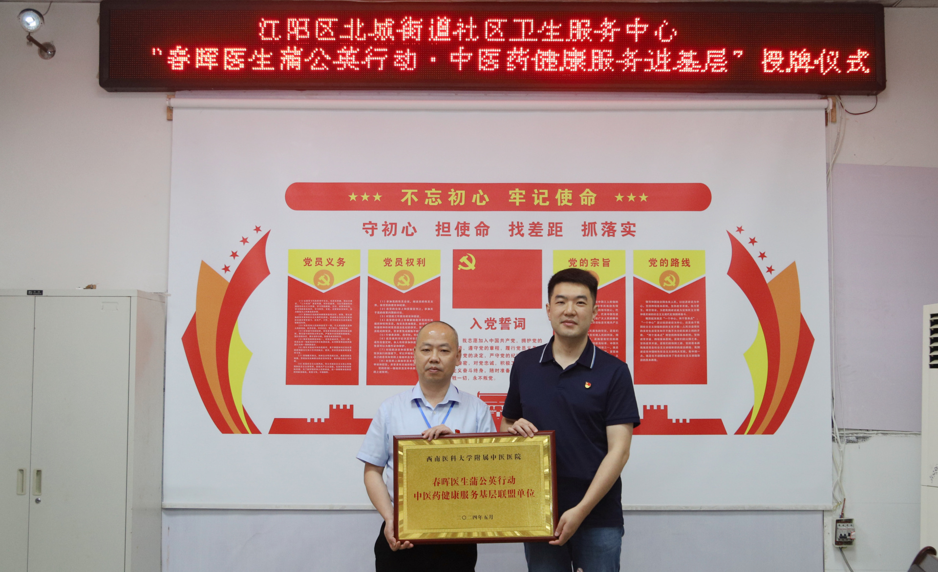 2024年5月9日,我院骨伤科手外·儿骨·烧伤整形党支部与江阳区北城街道社区卫生服务中心举行了春晖医生蒲公英行动·中医药健康服务基层联盟单位授牌仪式,医院副院长张磊、北城街道社区卫生服务中心党支部书记陈源、医院相关党支部成员及社区卫生服务中心人员等参加了仪式。