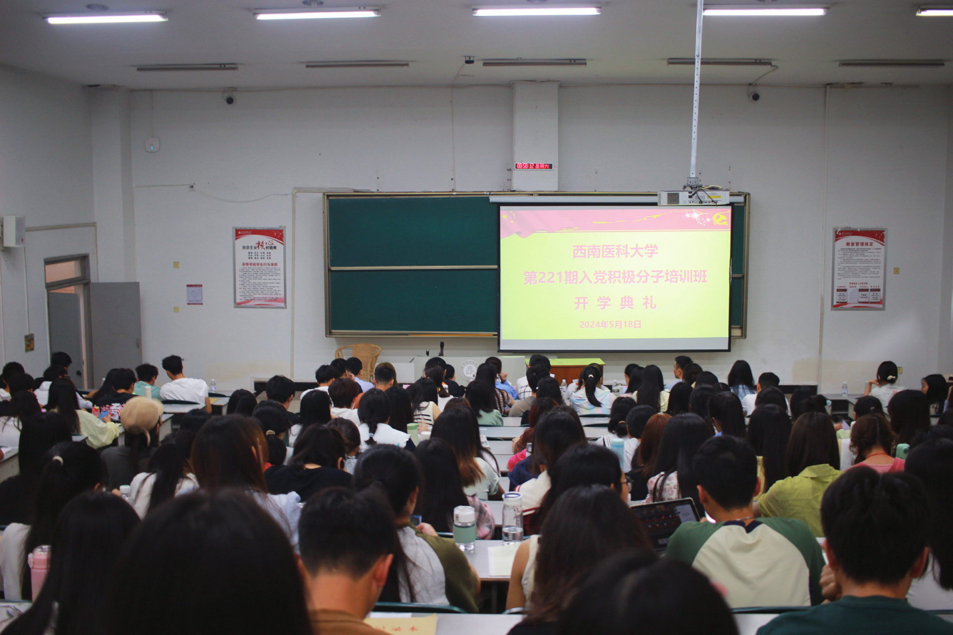 2024年5月18日,西南医科大学党校第221期(中西医结合学院分党校第22期)入党积极分子培训班在荟文楼103举行。中西医结合学院·附属中医医院党委书记、分党校校长李志,党委副书记、分党校副校长雷学举,学生党总支书记、分党校校务委员谢晓东,相关职能部门负责人及182名入党积极分子参加了开班典礼。开班典礼由雷学举主持。