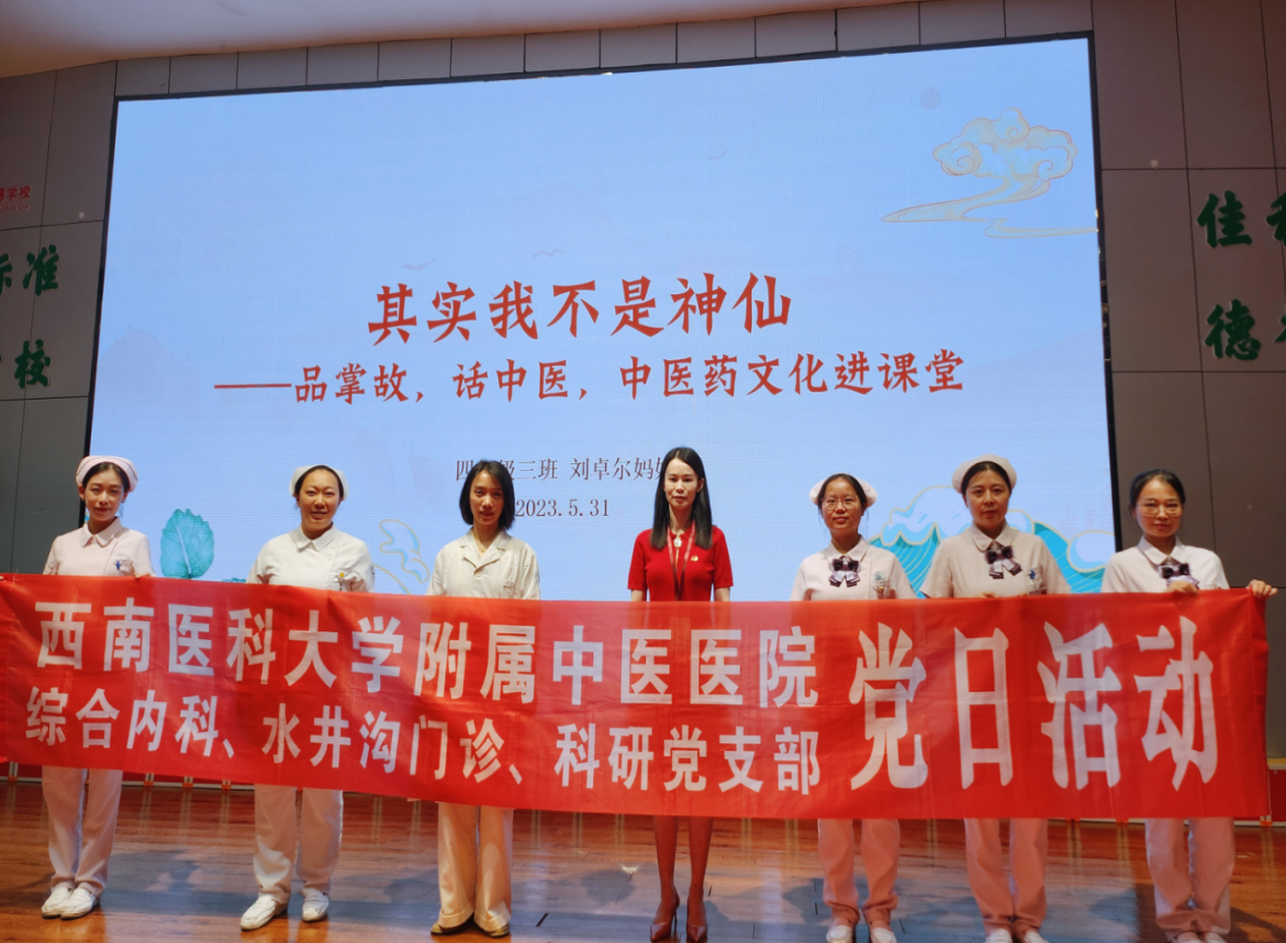 5月31日,综合内科党支部联合水井沟门诊党支部、科研党支部、心脑电图科党支部到泸州枫叶佳德学校开展了春晖医生进校园联合党建活动。活动中,水井沟门诊党支部书记蒙巍同志作了《其实我不是神仙——品掌故、话中医,中医药文化进课堂》专题讲座;相关支部医护人员为学校师生进行了血压、心电图监测,提供了艾灸、杵针等中医特色诊疗服务,并向同学们赠送了香囊。