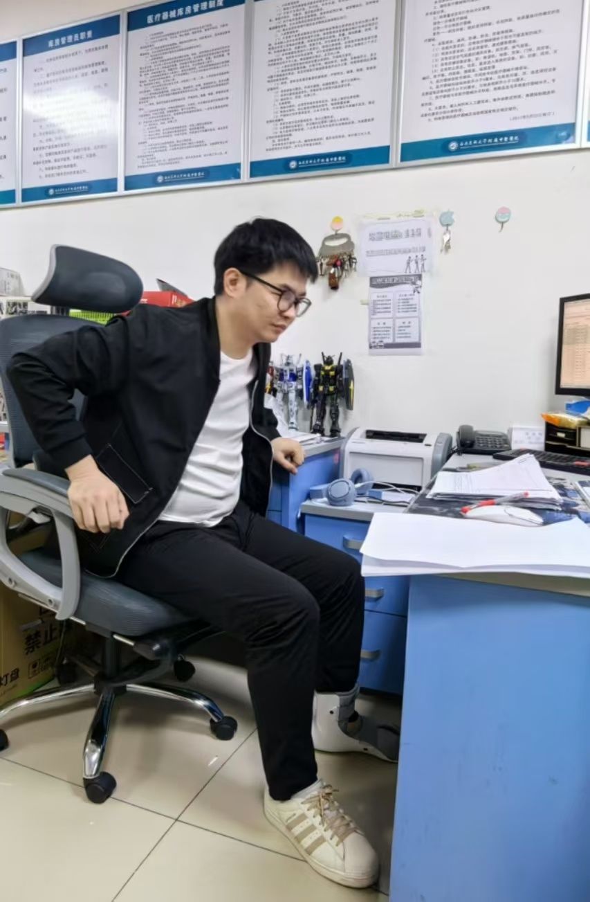 2024年10月10日,节后上班第3天,小编来到医院物资库房领物资,却看到左脚上捆绑着支具的邓其辉在电脑前忙碌着……