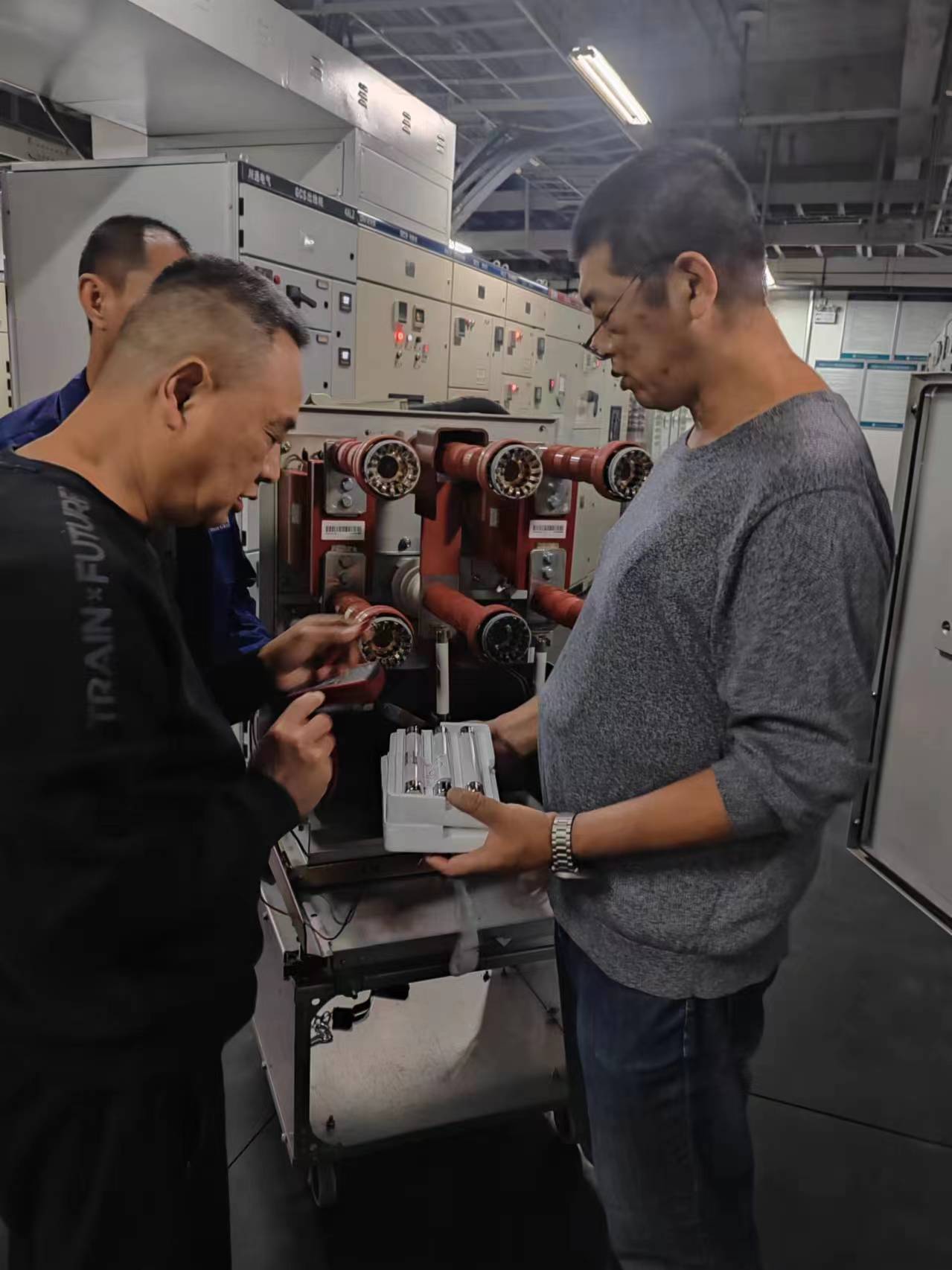 电工班现有16人,其中11人都是拥有超过十年工作经验的“老员工”。今年刚满55岁的刘辉宇,自2010年医院城北新院建成这年就来到医院工作,一干就是14年。从忠山院区装修改造的电气施工,主、备供电力变压器增容,配电设备及室外配电线路的升级;水井沟门诊部装修改造的电气施工,电力变压器增容、10KV供电电源环网柜安装、配电设备的升级到城北院区供电方案的确定,第三住院部UPS不间断电源优化,整个医院的供配电从图纸设计、建设施工到竣工验收他都亲力亲为。他与后勤电工班组全体成员一道,为医院节约建设投资数百万元。大家都说,医院里没有哪一条线路是刘辉宇不清楚的。2013年、2021年,他分别提出第一住院大楼、行政楼及外围路灯灯具节能改造方案,并牵头实施,为医院极大地节约了电耗运行成本。