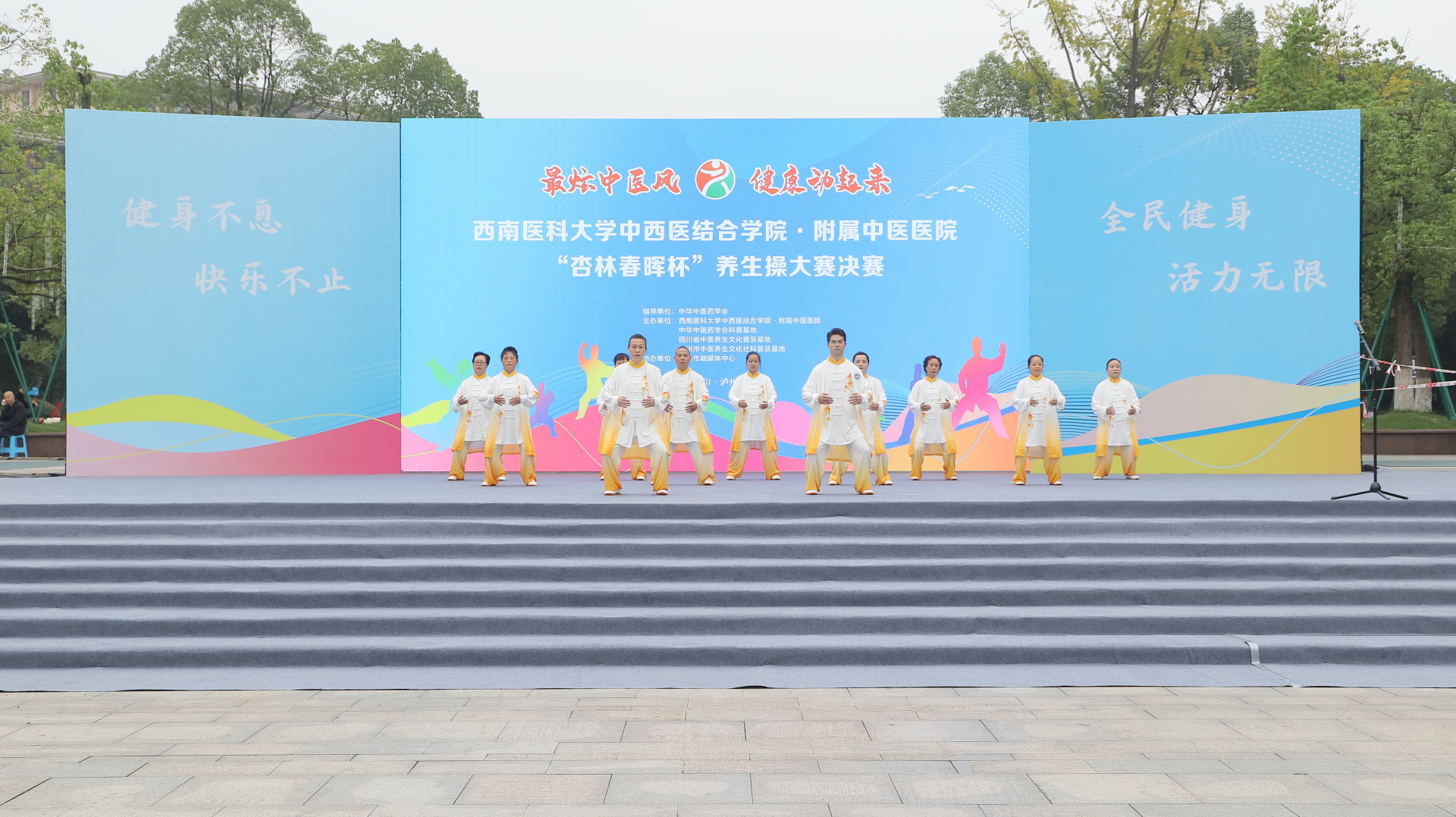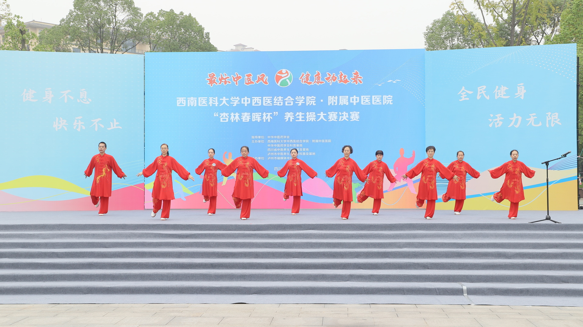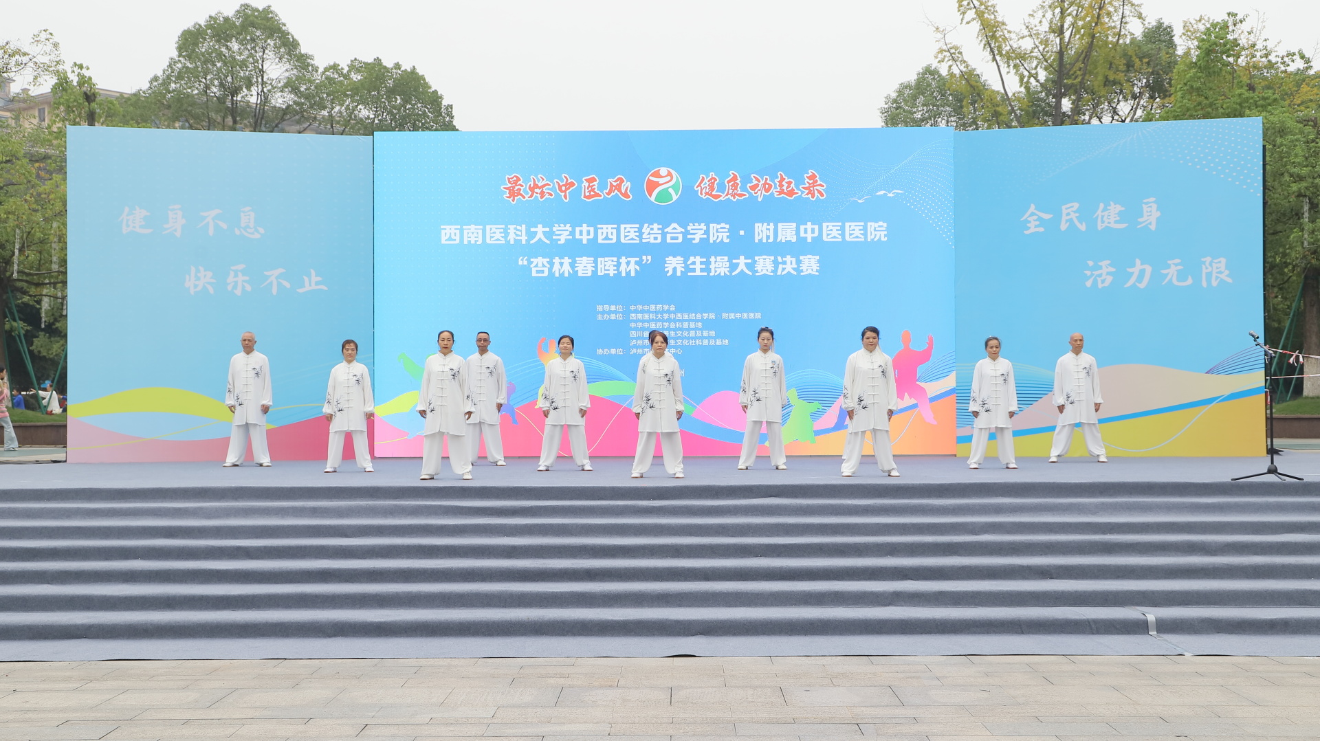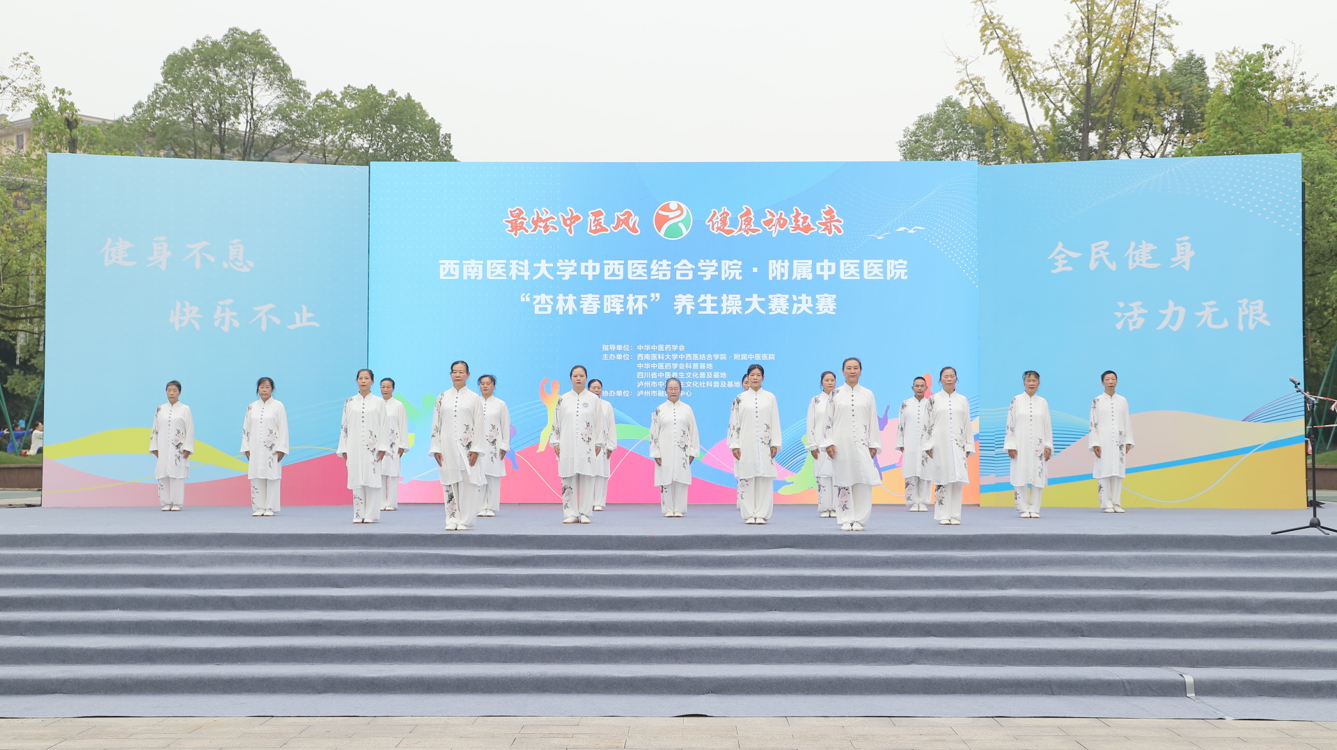 2024年11月3日,我院在江阳公园举行主题为“最炫中医风 健康动起来”的“杏林春晖杯”养生操大赛决赛。医院党委副书记雷学举、副院长张磊、泸州市融媒体中心党委副书记袁璇等领导,5位专家评委以及8支决赛队伍参加了活动。