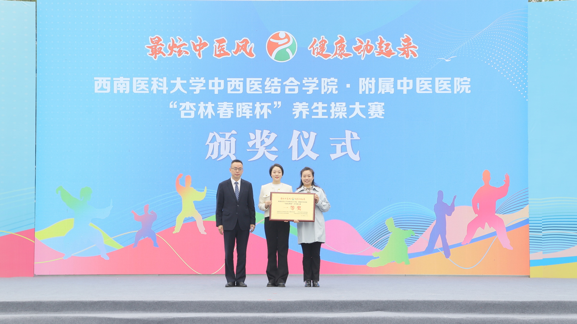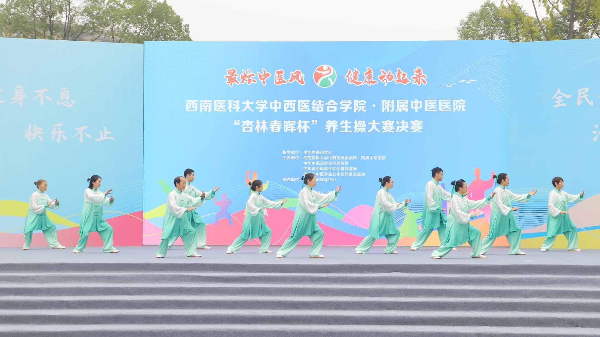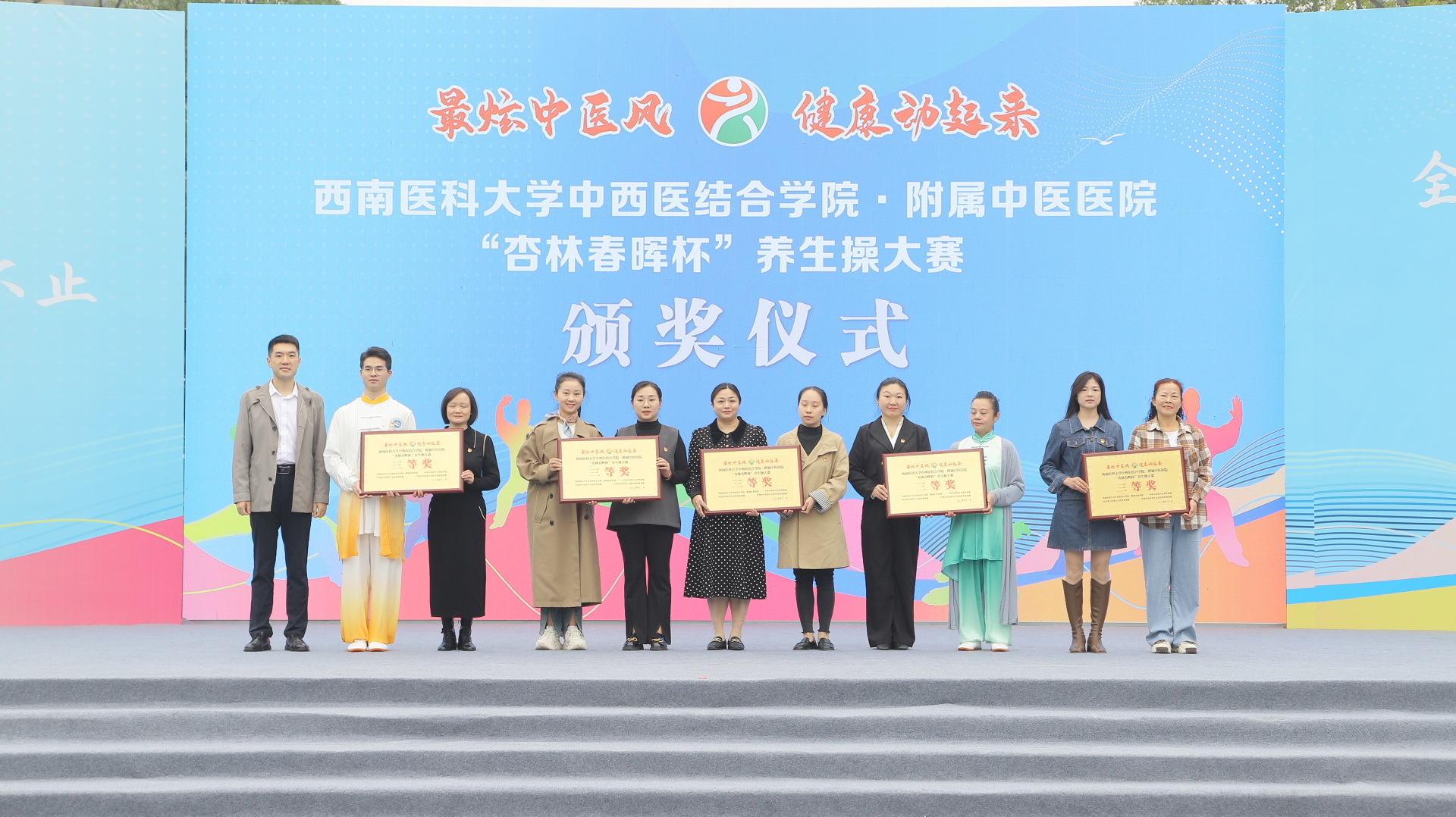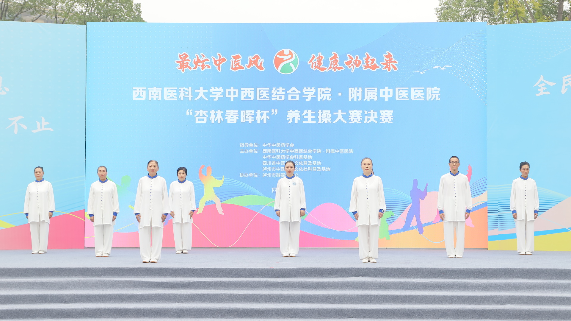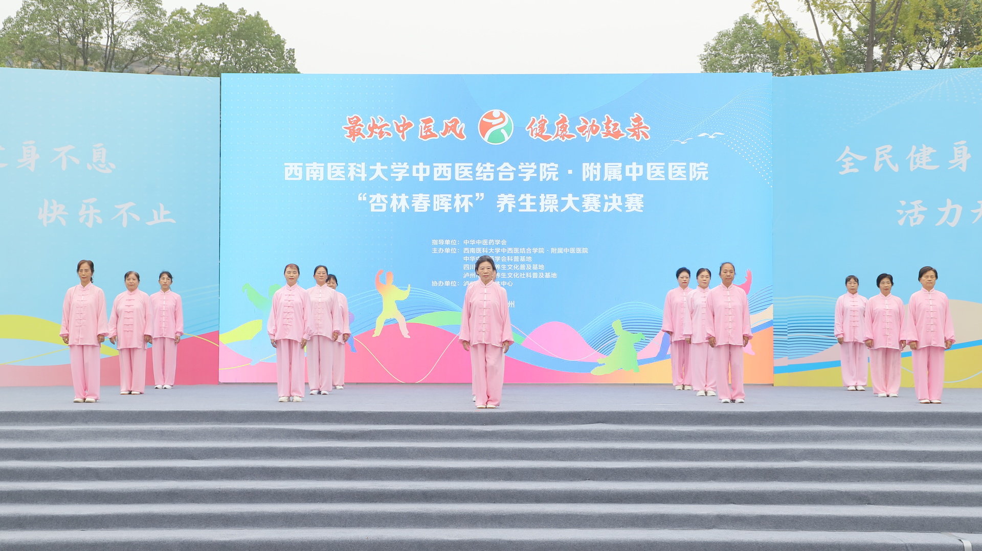 2024年11月3日,我院在江阳公园举行主题为“最炫中医风 健康动起来”的“杏林春晖杯”养生操大赛决赛。医院党委副书记雷学举、副院长张磊、泸州市融媒体中心党委副书记袁璇等领导,5位专家评委以及8支决赛队伍参加了活动。