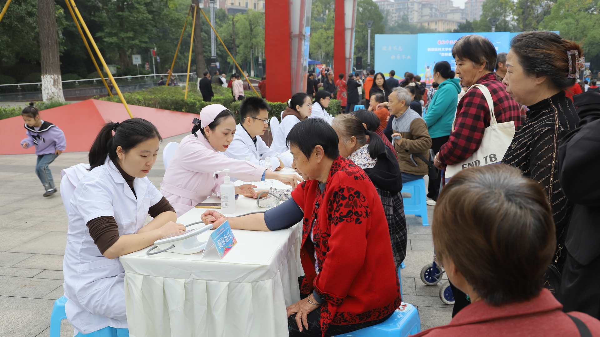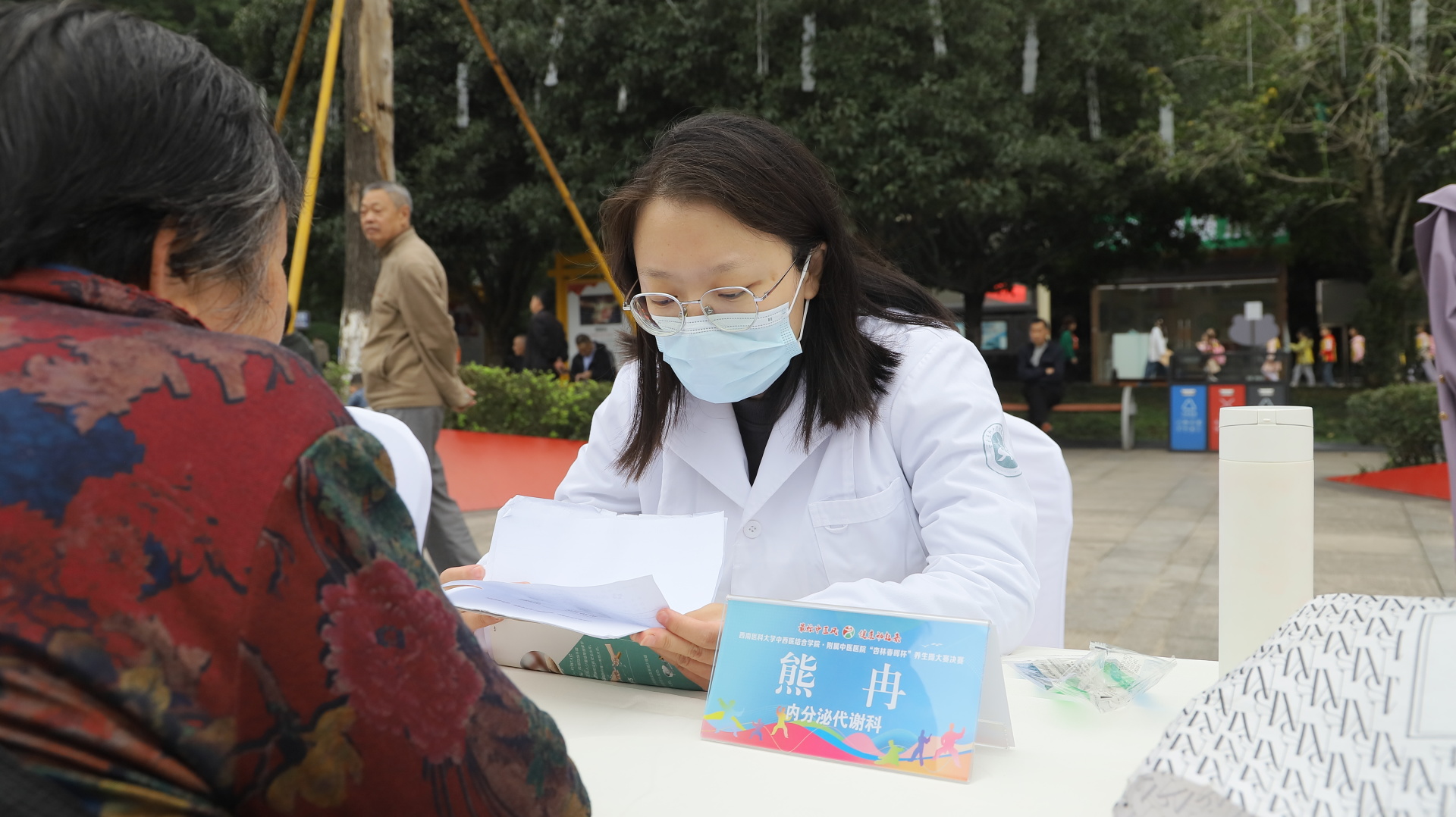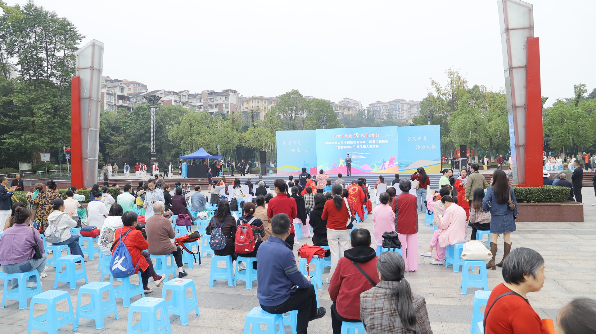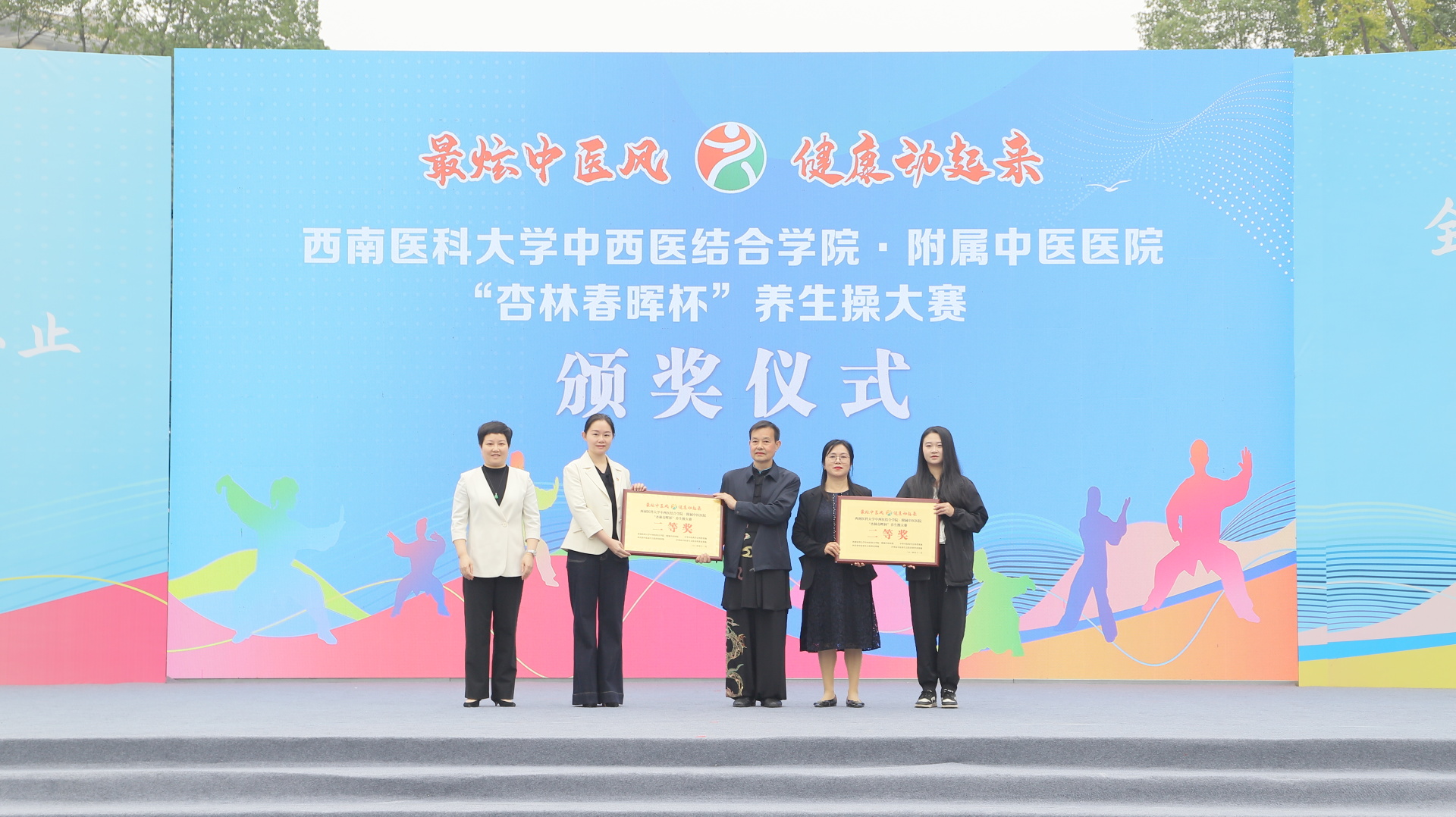 2024年11月3日,我院在江阳公园举行主题为“最炫中医风 健康动起来”的“杏林春晖杯”养生操大赛决赛。医院党委副书记雷学举、副院长张磊、泸州市融媒体中心党委副书记袁璇等领导,5位专家评委以及8支决赛队伍参加了活动。