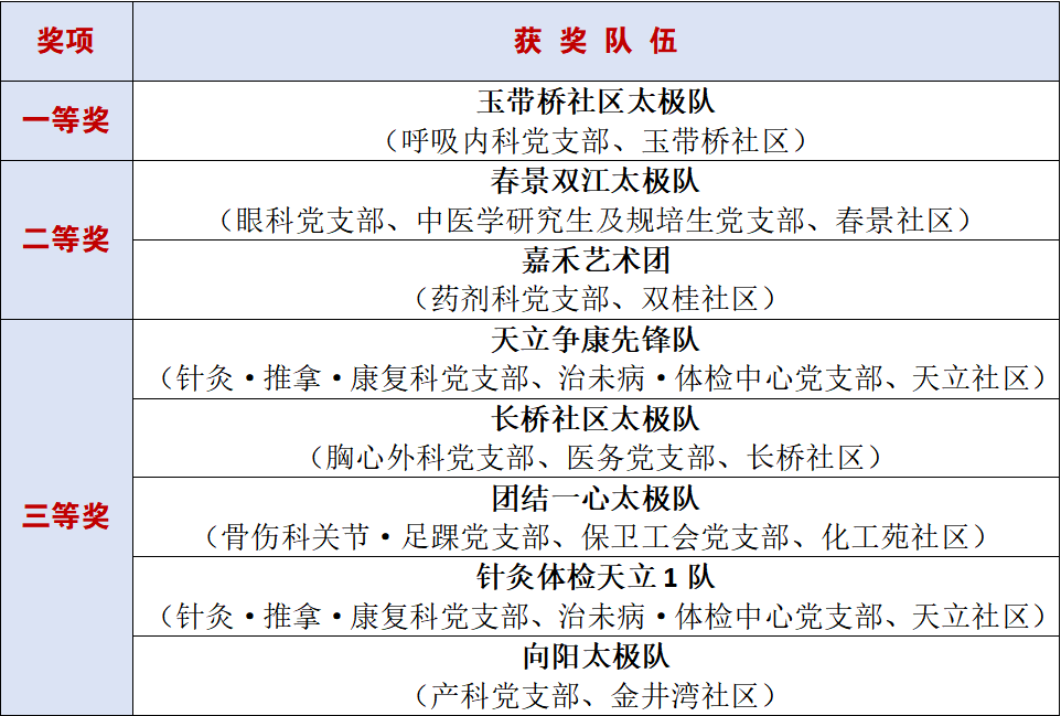 据悉,今年4月,医院在全市范围内以社区为参赛单位启动了“杏林春晖杯”养生操大赛。医院各党支部主动联系对口社区,积极动员社区居民参赛。此项活动经初赛、半决赛和决赛,历时八个月,在全市范围内营造起了学习中医养生操及养生健康保健知识的良好氛围。
