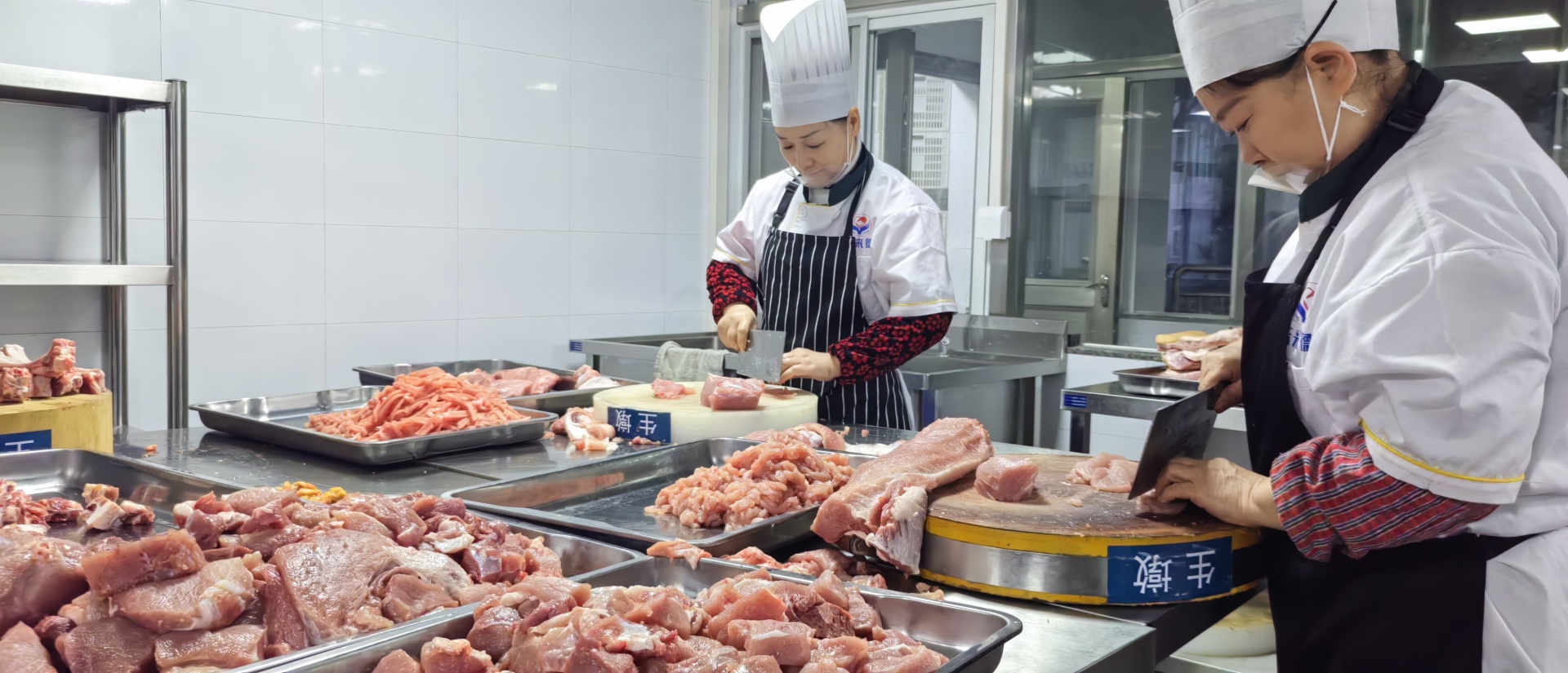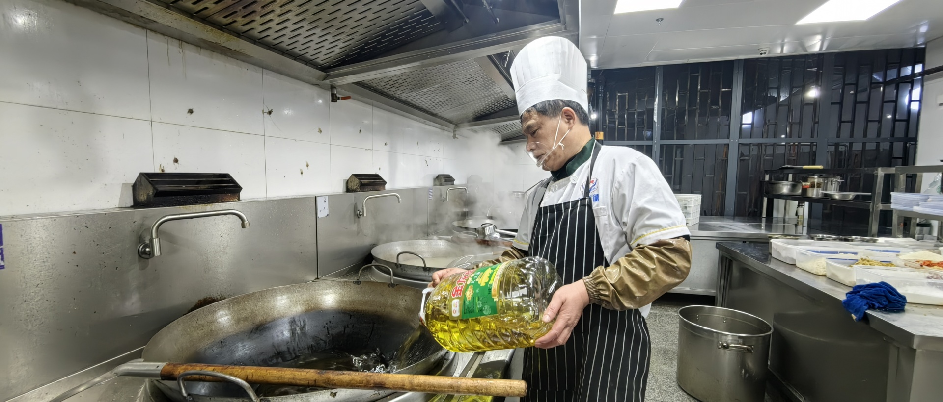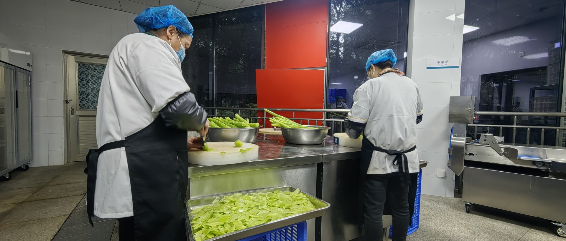 强化菜品“新鲜”供应,早上4:30,后厨已是一番热火朝天的景象,齐刷刷的削皮声、哗啦啦的洗菜流水声、砰砰砰的剁肉声,锅碗瓢盆的碰撞声……烟火气里,锅铲翻飞,火焰跳跃,暖烘烘的饭菜浓香扑面而来。
