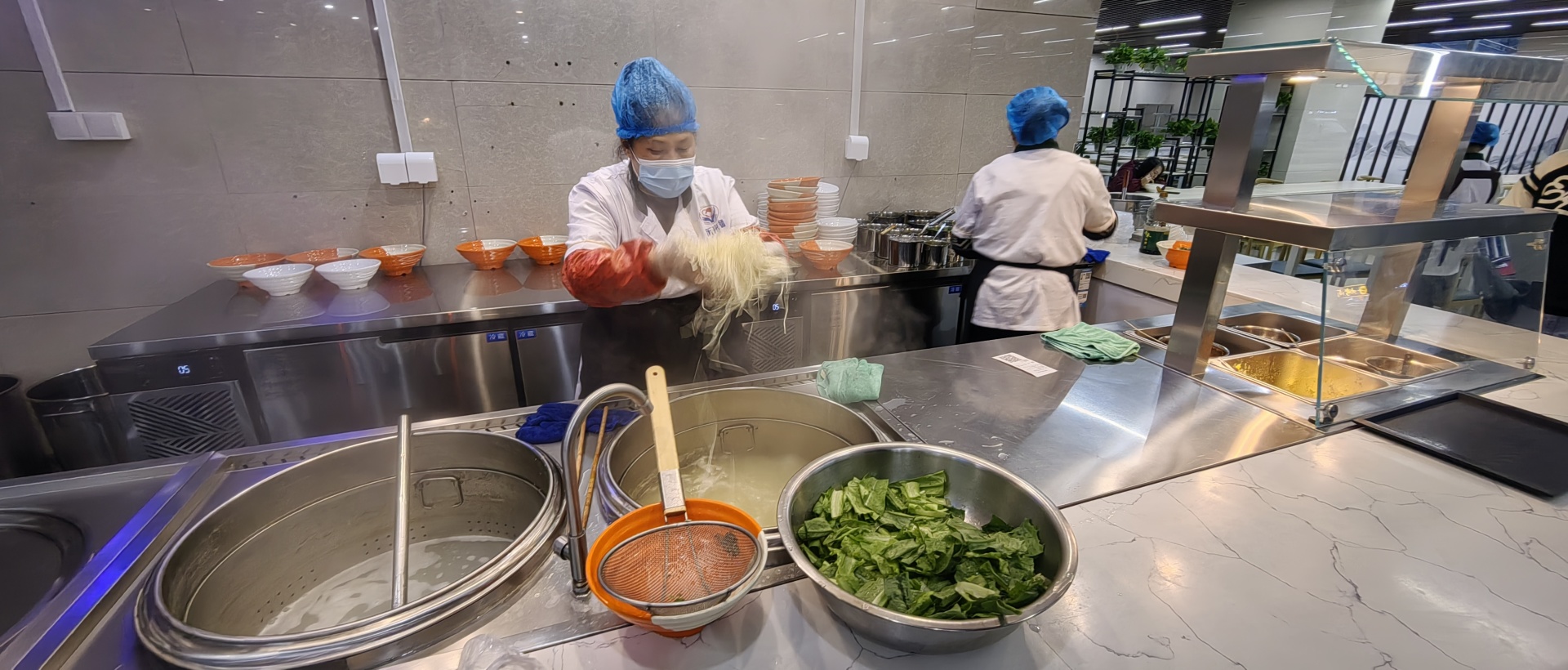 早7:00,走进西南医科大学附属中医医院医院城北院区食堂——营养餐厅,煮面区的灶台上早已热气腾腾……