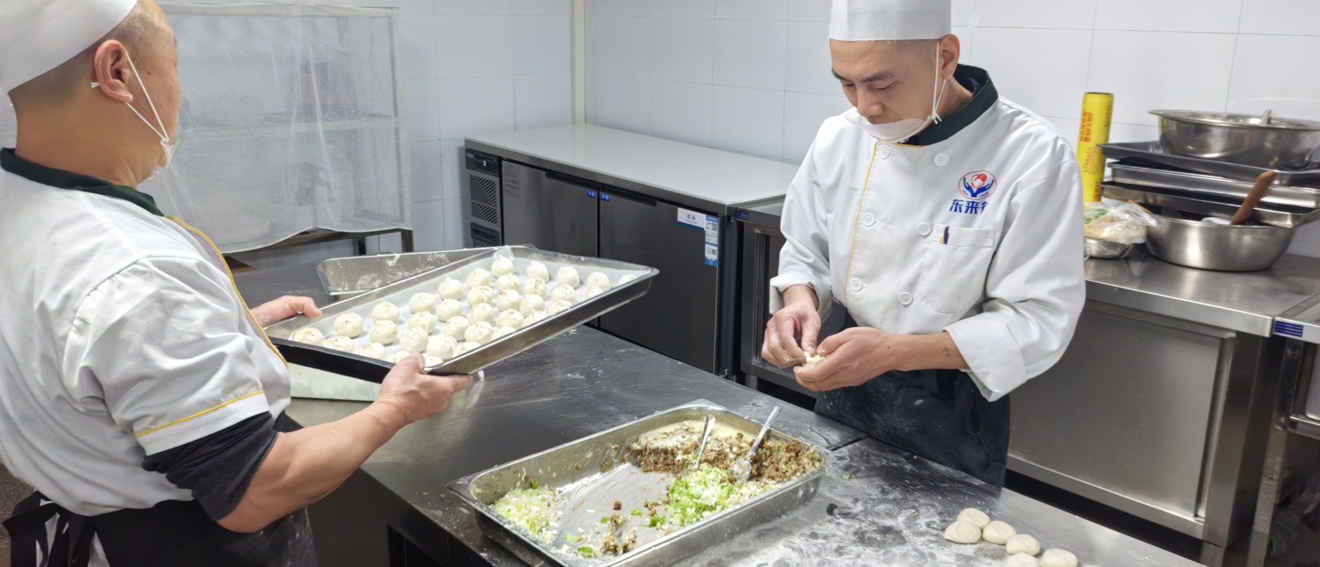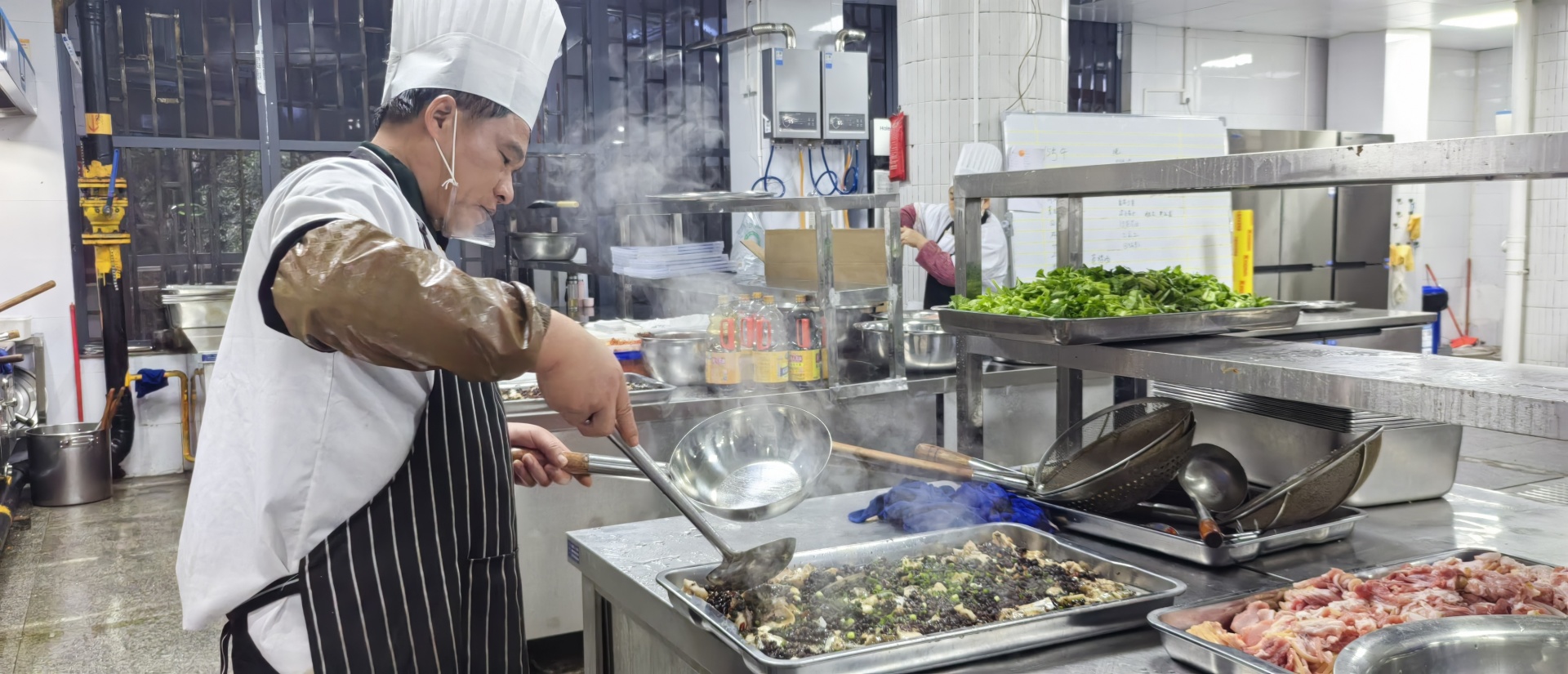 食堂采用“前店后厂”模式,蔬菜加工、肉类加工、面点间、凉菜间、烹饪区、洗碗间等多个区域严格分隔。加工区里,叶菜类蔬菜在水中完全浸泡15分钟以上,5名师傅正在对原材料进行清洗、切削等初步处理;面点间内,两名师傅正在制作今天的酱肉包子;烹饪区内,翻炒、卤煮、颠勺、焖蒸,一锅锅美味在大厨们的巧手下蒸腾出炉,这位大厨正将刚刚送来的“金龙鱼”倒置锅中……
