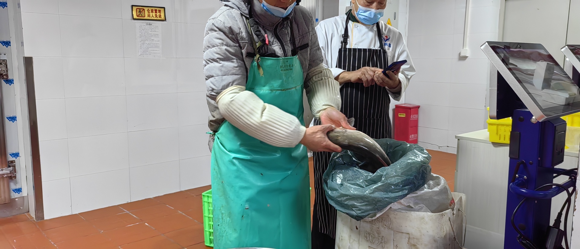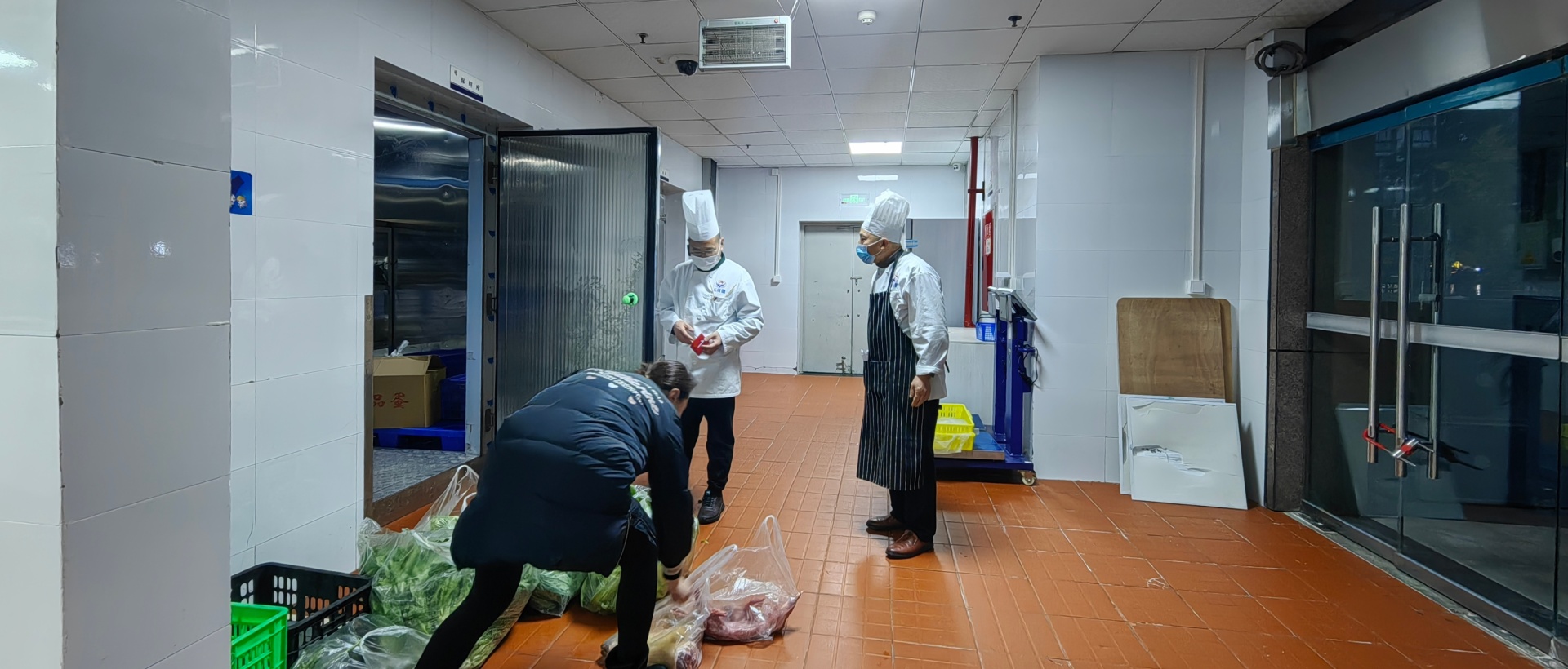 食品安全监督员、库房管理员与食材供应商一起认真核对送货单与实际送货是否一致,如:食品名称、级别、规格、数量、重量,逐一对食材进行验收。肉蛋禽类必须持有检验检疫的合格证明,蔬菜水果需经过精心挑选与农药残留检测,米面油要包装完整、在保质期内等,确保每一根菜都有源可溯。