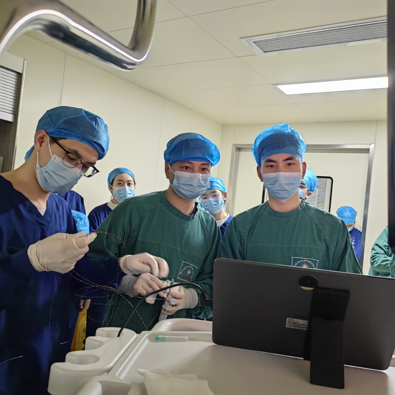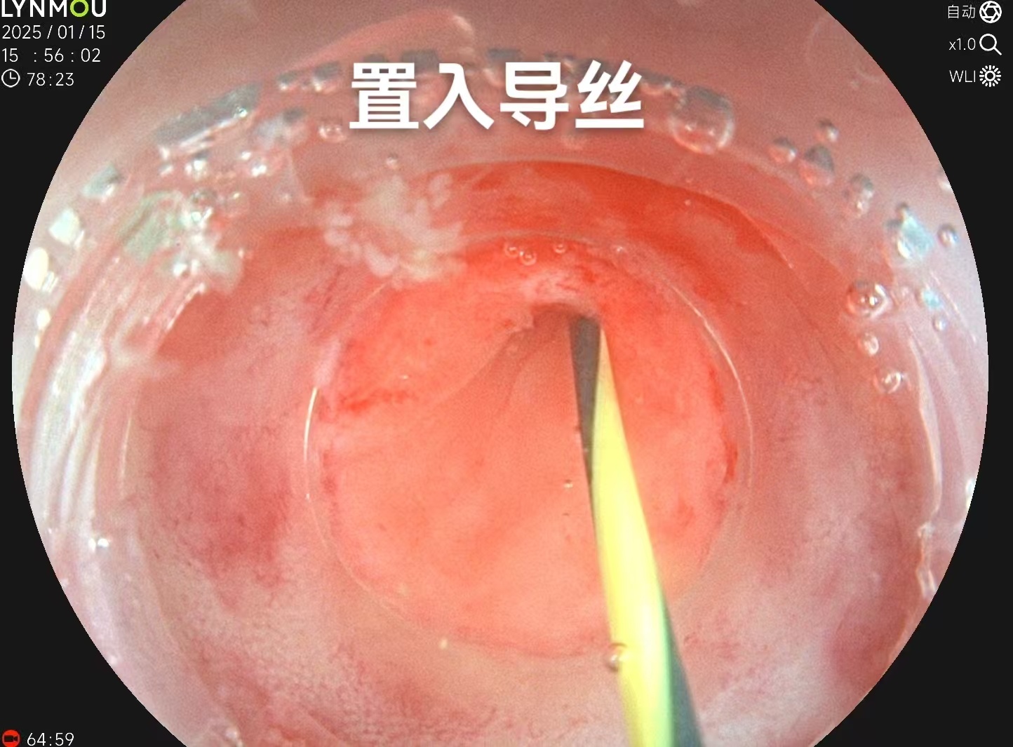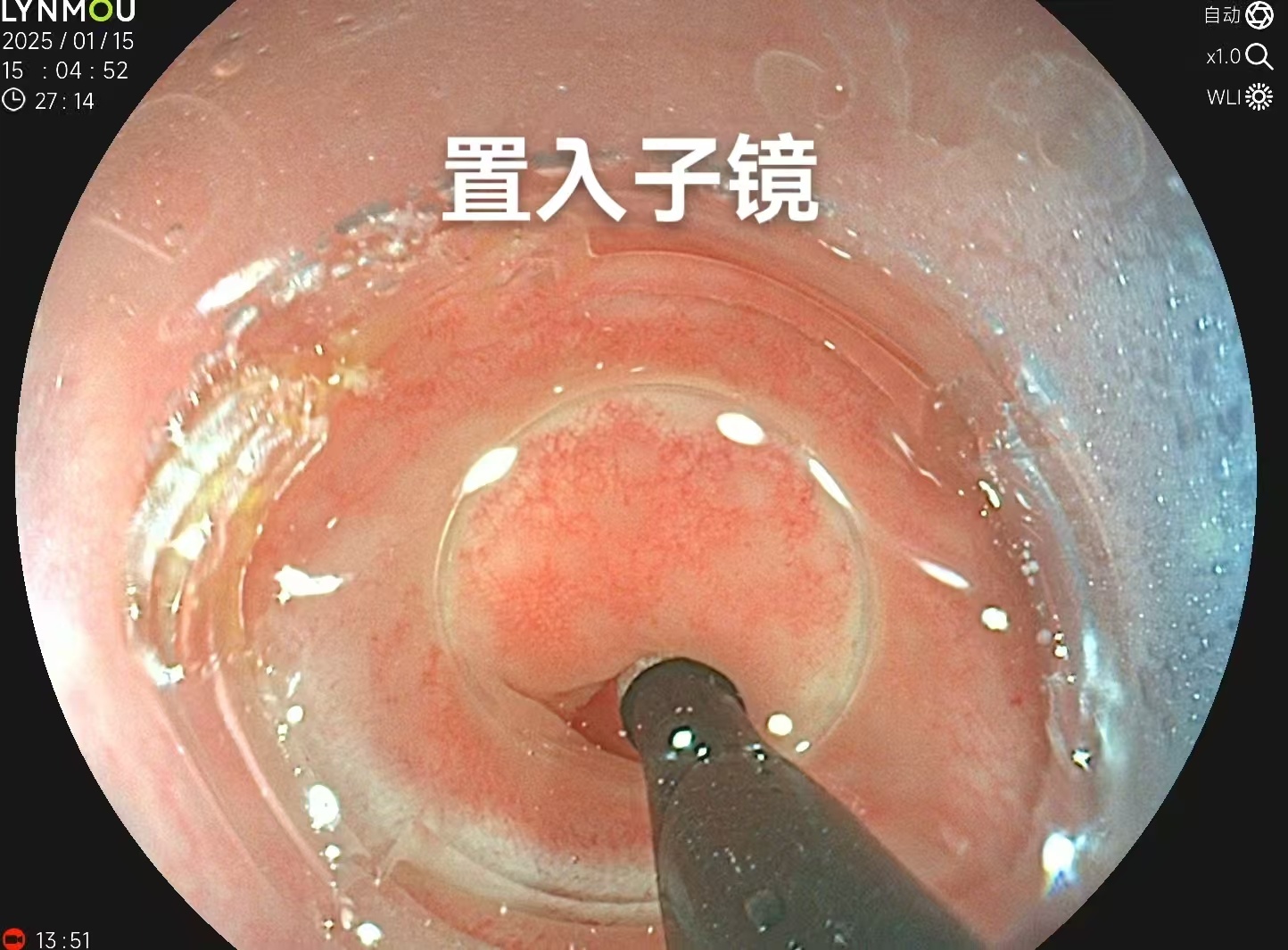 手术开始,科室主任李五生教授在一旁密切关注手术进展,蒋青峰全神贯注地操作肠镜,待肠镜顺利到达阑尾口后,他小心翼翼地经肠镜置入胆道子镜。余腾江医生在一边默契配合,熟练地调整着肠镜与胆道子镜的角度和深度,确保胆道子镜能精准进入阑尾腔内。