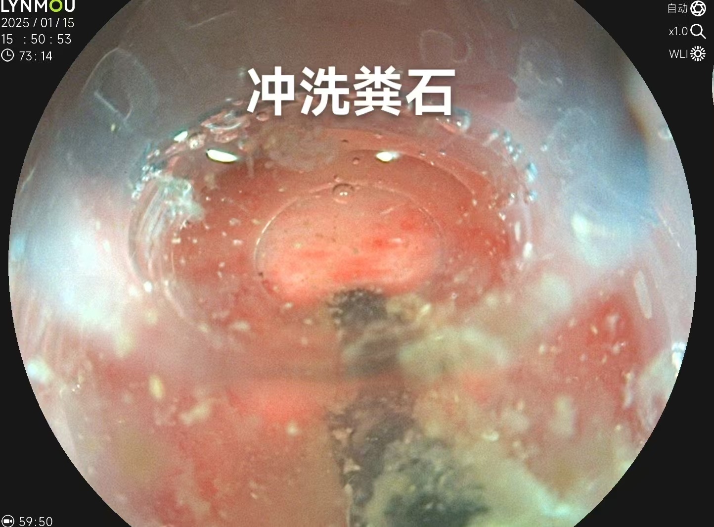 进入阑尾腔后,蒋青峰操控胆道子镜对阑尾腔内进行细致冲洗,随着冲洗液的流动,嵌顿的粪石逐渐松动。