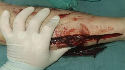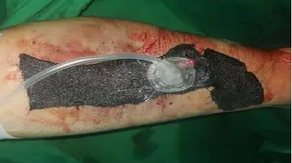 经过两天的紧张治疗,刘大叔的病情终于出现了一丝转机,肾功能有所好转,心衰症状也得到了一定程度的缓解。然而一波未平,一波又起,刘大叔出现了新的临床症状——发热,而且小腿依然肿胀明显,皮温居高不下。难道是小腿坏死伴感染加重了?医生们不敢有丝毫懈怠,根据 MRI 检查情况,他们发现刘大叔的左小腿、左脚存在组织坏死的情况,果断决定进行手术切开减压引流,清除病灶坏死组织。手术中,医生们看到左小腿下段内侧伤口深层筋膜部分坏死,比目鱼肌少许肌肉变黑坏死。