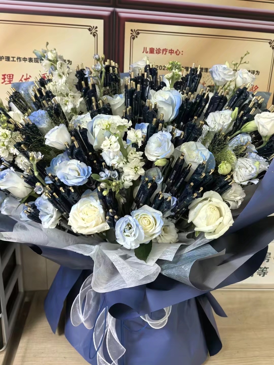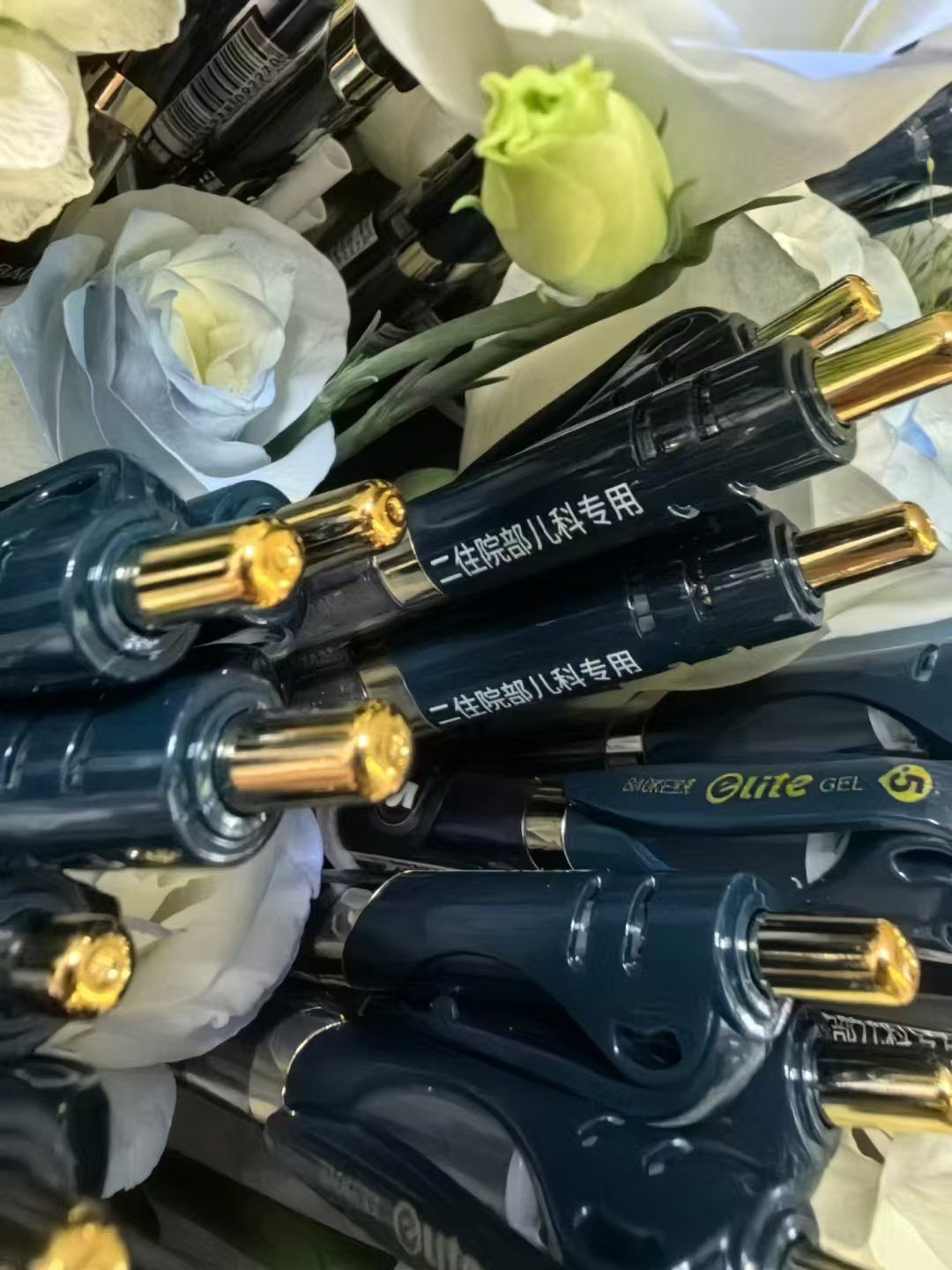 更令人惊喜和感动的是,家属还带来了一束极其特别的“花束”——它由数支崭新的、印有醒目标识的签字笔精心捆扎而成。每一支笔上都清晰地印着“二住院部儿科专用”的字样。