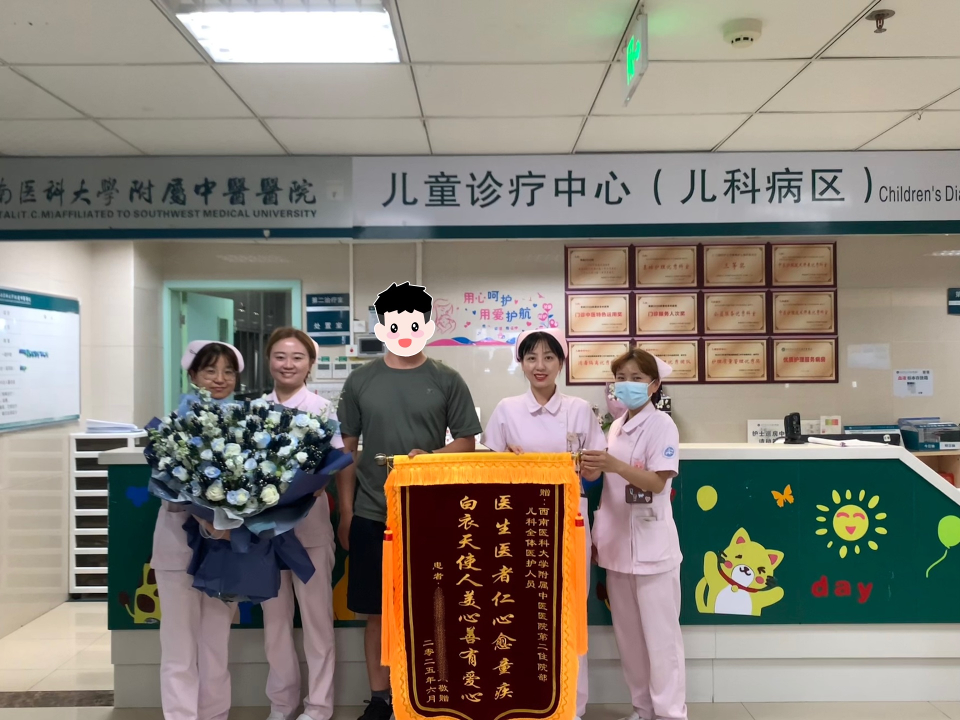 经过一段时间的精心治疗和护理,患儿康复出院。家属对儿科诊疗中心(儿科病区)全体医护人员充满了感激之情。为表达这份心意,他们特意定制了一面锦旗,“医生医者仁心愈童疾,白衣天使人美心善有爱心”。