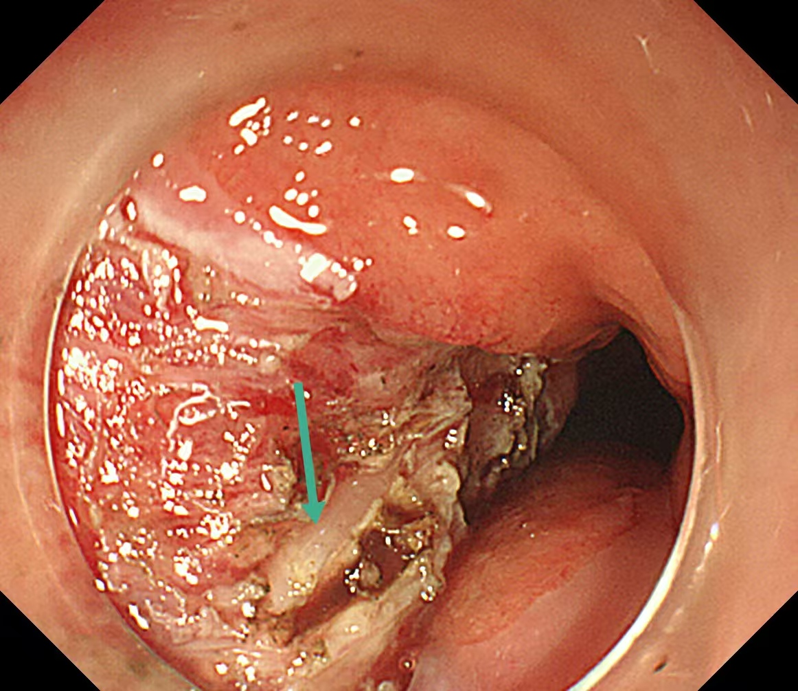 随着胃镜插入食管,刘蔚在患者食管入口处查见一脓肿,顶端有一开口样凹陷。轻轻按压,竟有脓液从一个细小的破口处不断冒出,结合CT报告和患者卡刺一周的病史,刘蔚立刻判断:这根鱼刺不是常规横卡在食管腔,应是由此处刺破了食管黏膜,钻进了食管壁的夹层中,在里面“潜伏”了整整一周,持续刺激食管壁,引发了严重的感染化脓,形成了脓肿。