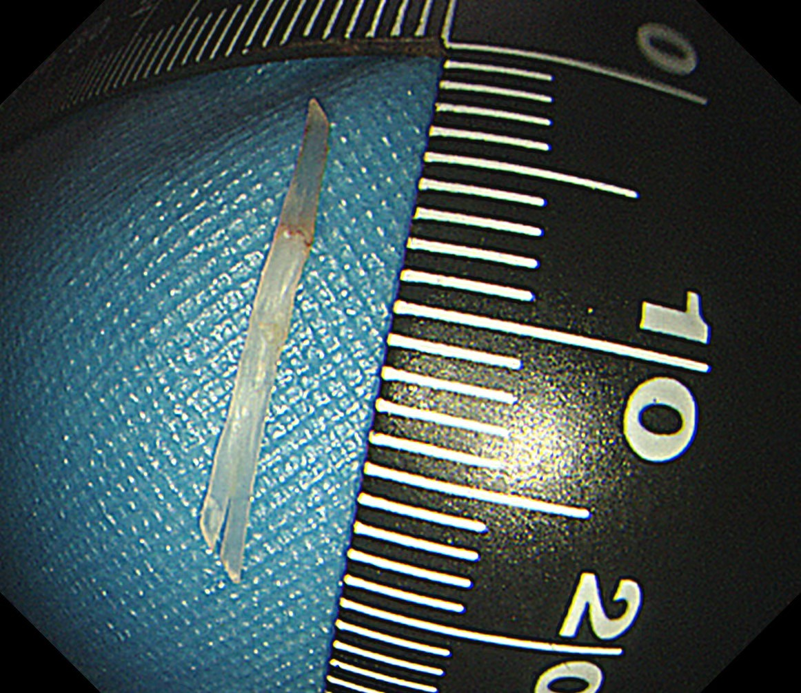 手术台上,刘蔚先小心翼翼切开脓肿处的食管黏膜,大量黄色脓液瞬间涌出,先为食管“排脓减压”;随后逐层探查,黏膜下层翻找无果,便屏住呼吸,在毫厘之间轻轻切开固有肌层,目光紧紧锁定视野,在与肌肉颜色近乎一致的地方,终于发现了那根“藏猫猫”的鱼刺!刘蔚轻夹鱼刺,慢慢提拉,生怕稍一用力刺破食管壁,这根长度1.5厘米的鱼刺,终于被成功取出,与CT报告完全吻合。