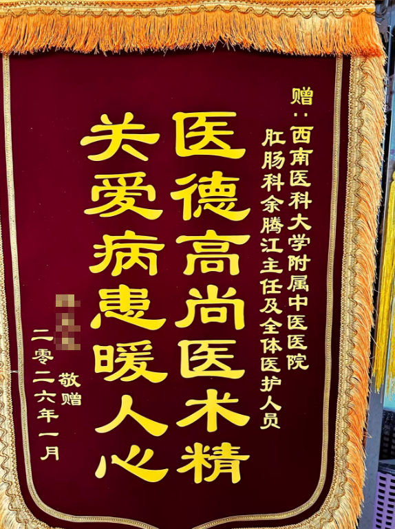 “砰砰,砰砰砰……”由一支身穿红衣的数人组成的腰鼓队,从西南医科大学附属中医医院门诊一路敲着欢快的鼓点,来到第三住院大楼肛肠科病区护士站前,将一面锦旗送到余腾江医生手中。