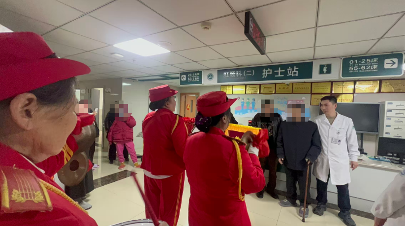 出院后,李爷爷和家属特意准备了一份“特别的感谢”,专门请来腰鼓队,一路敲着欢快的鼓点,从医院大门走到第三住院大楼肛肠科,吸引了不少人的目光。当家属将锦旗送到余腾江医生手中时,老人紧紧握着医生的手,眼里满是感动的热泪。