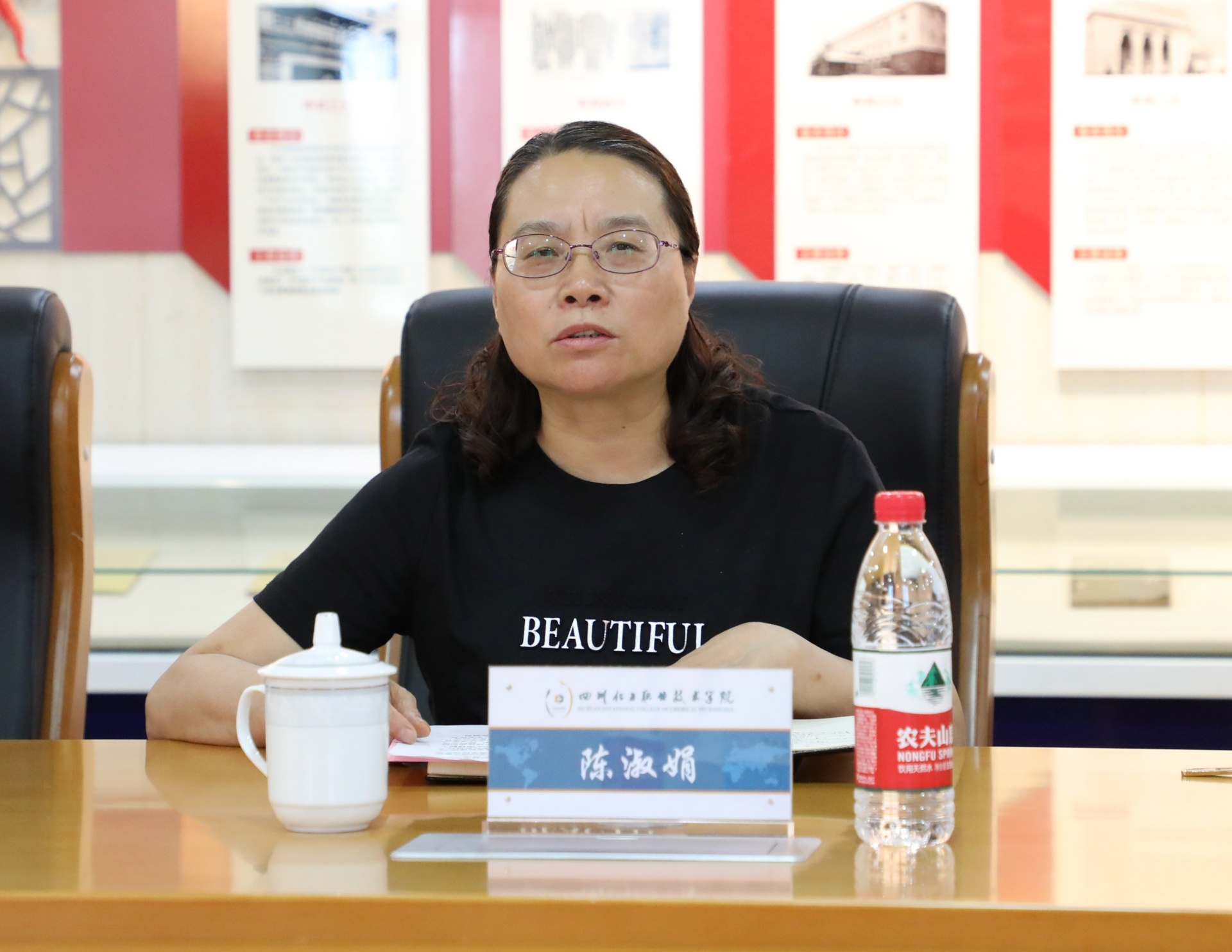 陈淑娟致辞,她介绍了四川化工职业技术学院基本情况,希望以此次授牌为契机,学校与院方加强合作和交流,弘扬中医药文化,增进我校师生对中华优秀传统文化的了解与认同,增强师生的文化自信、民族自信,推动中华优秀传统文化更好地传承和发展,不断发扬光大。