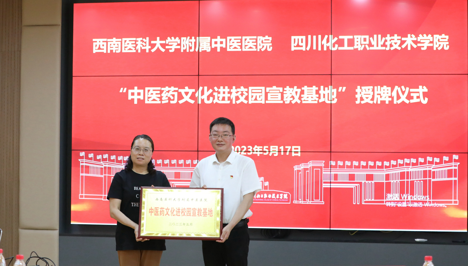 2023年5月17日,我院与四川化工职业技术学院举行中医药文化进校园宣教基地授牌仪式。我院副院长徐厚平,四川化工职业技术学院党委副书记、纪委书记、工会主席陈淑娟等校领导,我院相关临床科室及职能部门人员等参加了会议。会议由民盟四川化工职业技术学院支部副主委熊英主持。