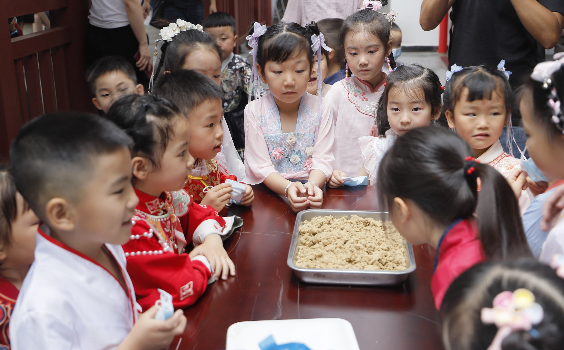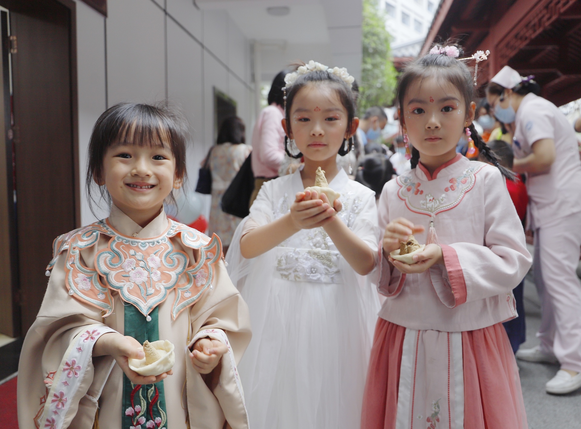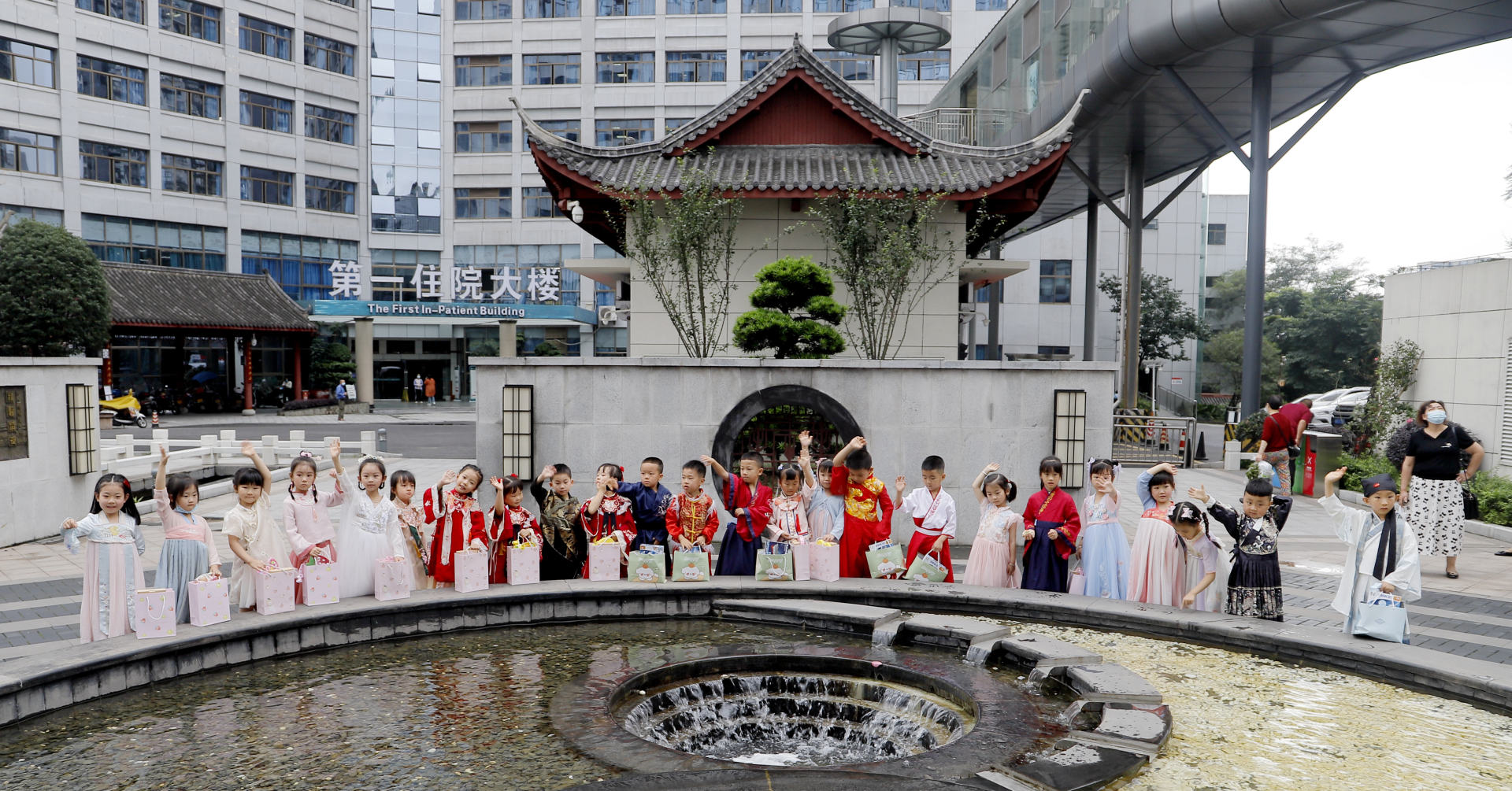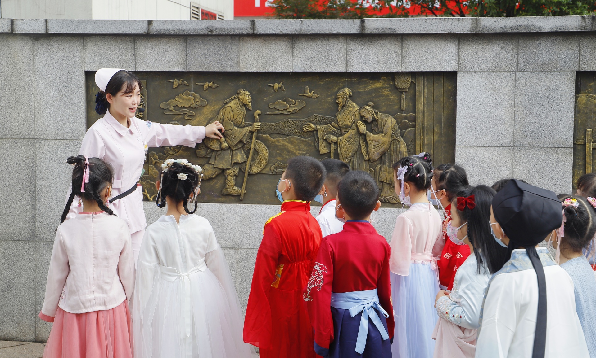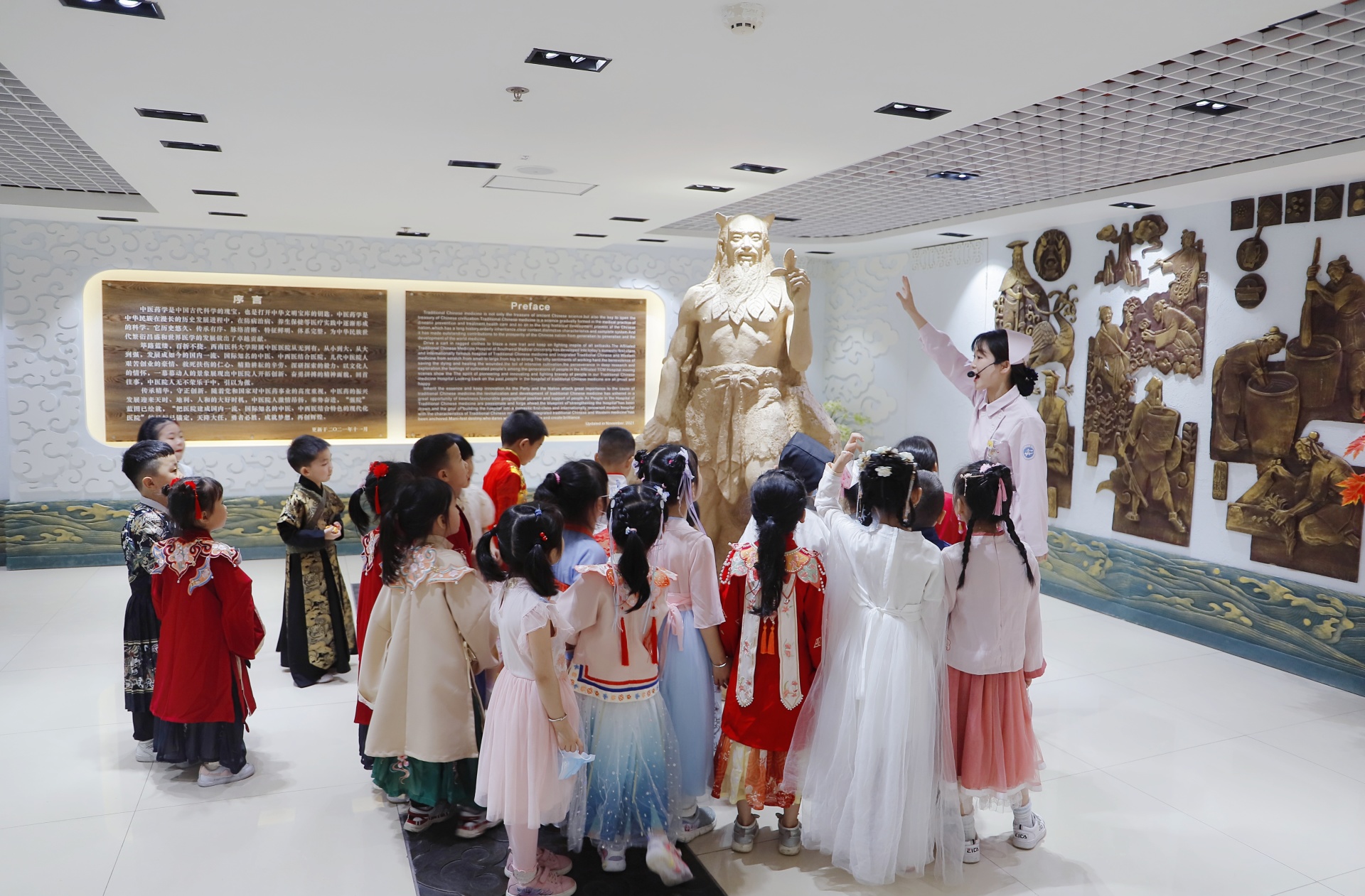 活动中,小朋友身着汉服在讲解员的带领下前往医院名医馆现场观摩了医生把脉问诊的场景;在医院的西南衣钵苑对枸杞、麦冬、金银花等10余种常见中药草本进行了辨识,听取了相应药材性味药性的介绍;在医院中医药文化博物馆·院史馆参观了各种中医药文物,如用于针灸的骨针、叶氏金针,古时中医外科所用到的手术刀具,中医典籍、药方等,聆听了中医药文化典故;最后,小朋友们前往中医特色诊疗中心,在护士小姐姐的指导下,亲自制作了面碗脐灸。
