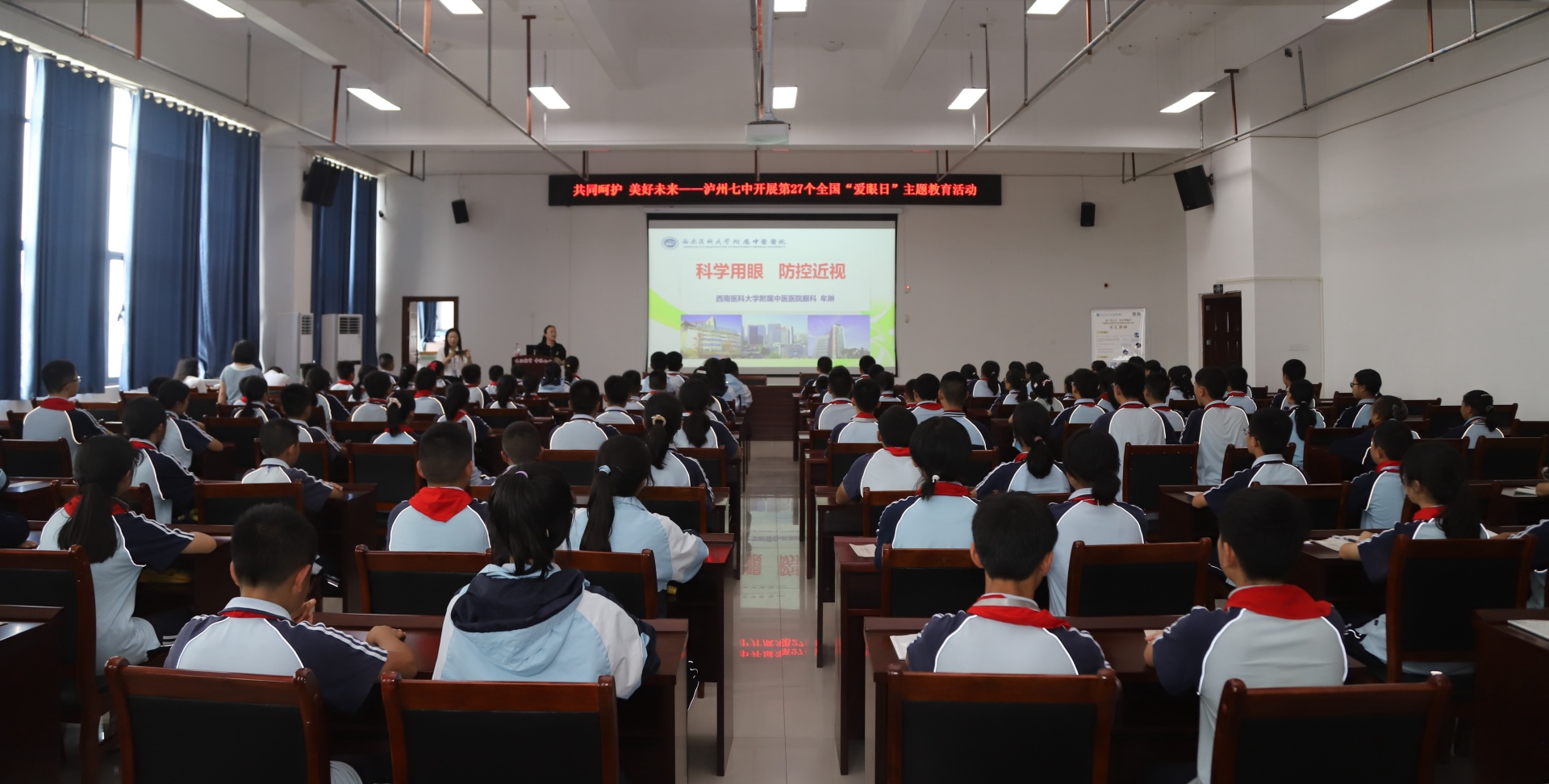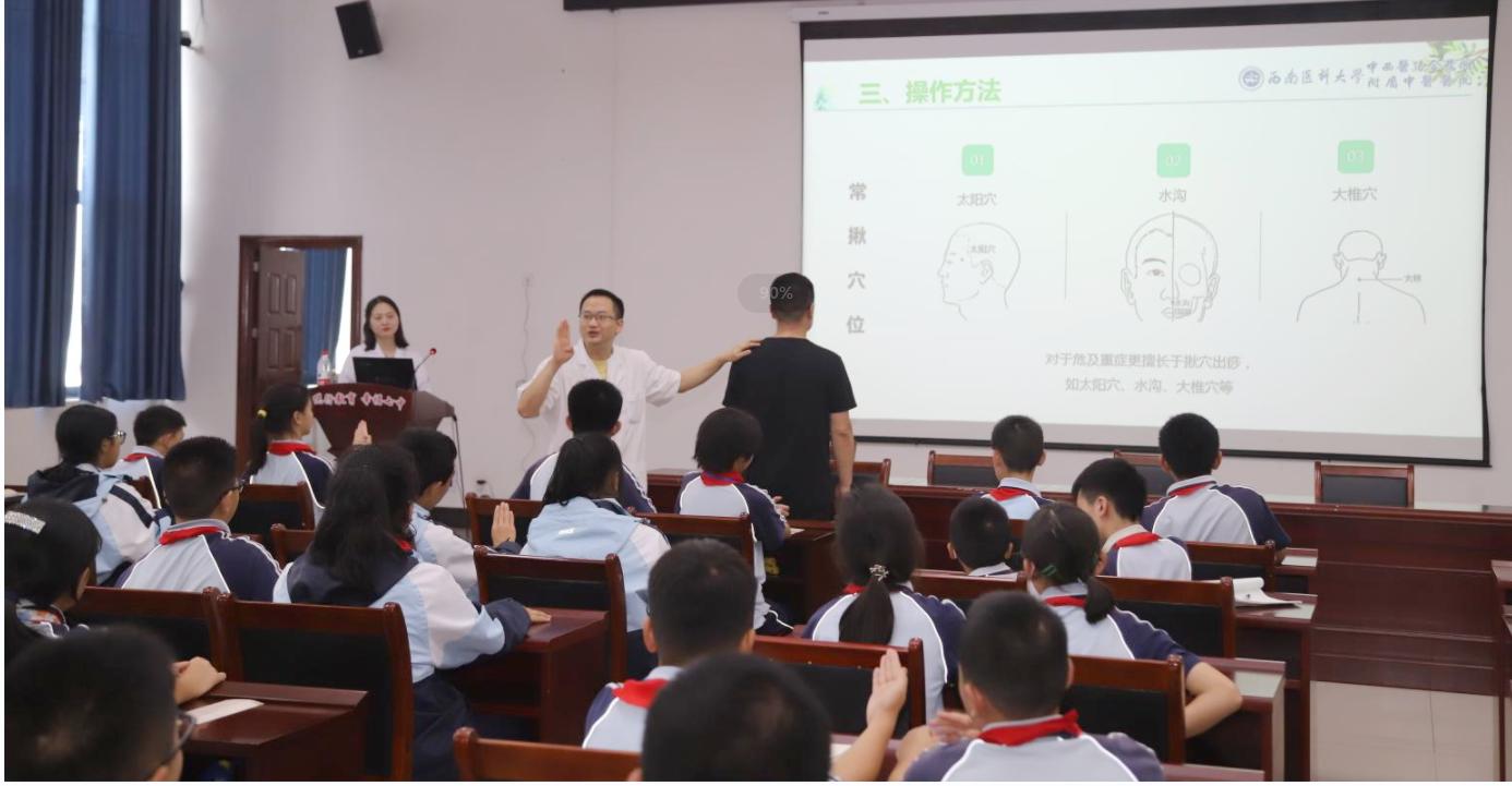 仪式后,我院眼科主任牟琳教授为泸州市第七中学校学生作了《科学用眼 防控近视》专题讲座,骨伤科创伤·正骨组刘薇、刘洋作了“宋氏揪痧法”专题介绍。