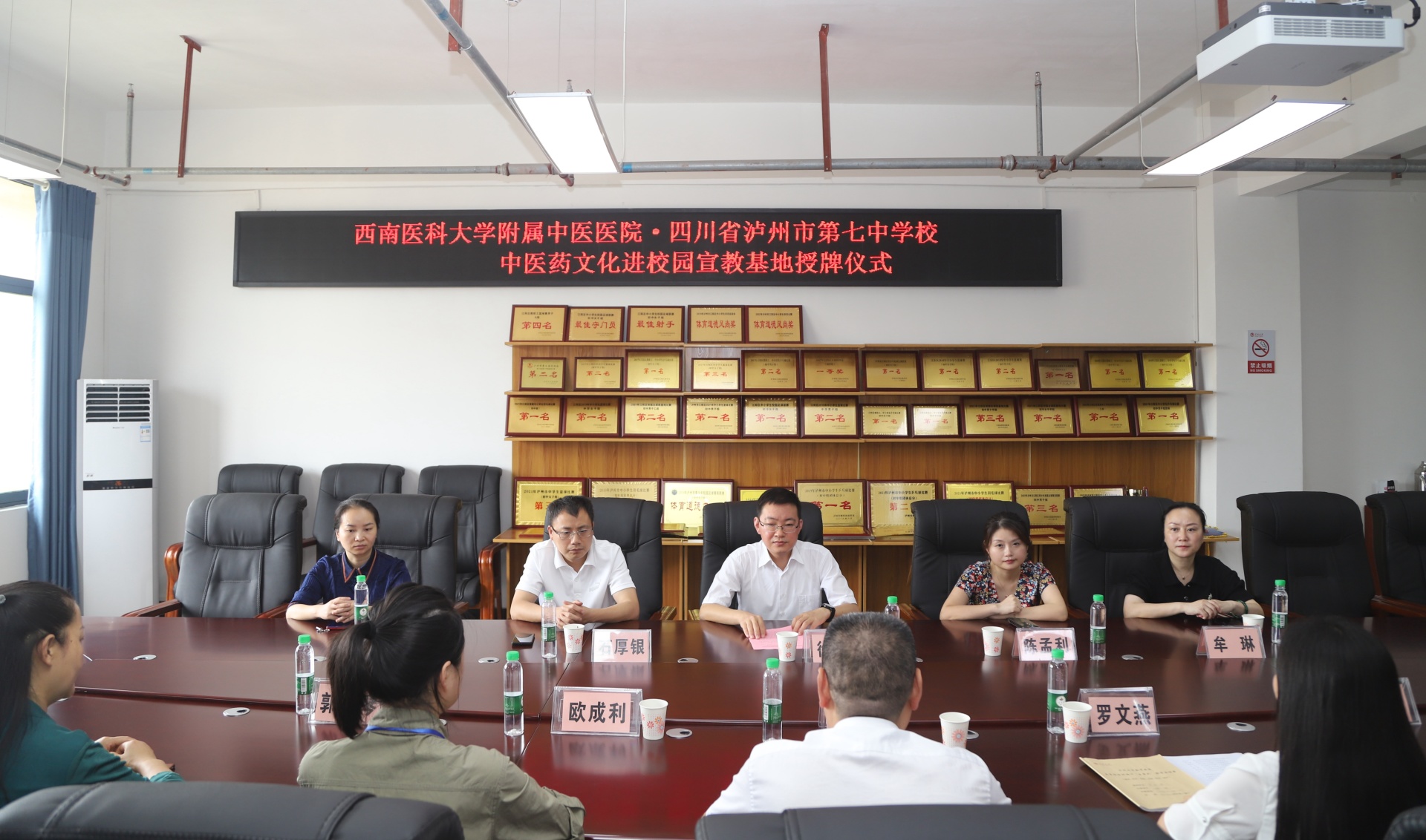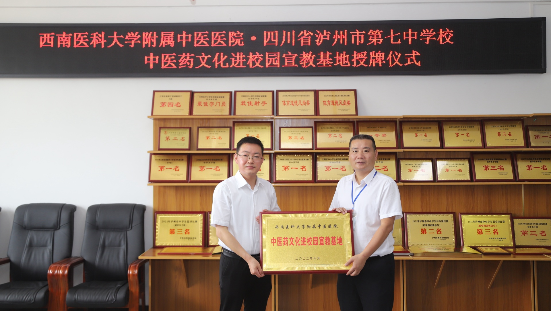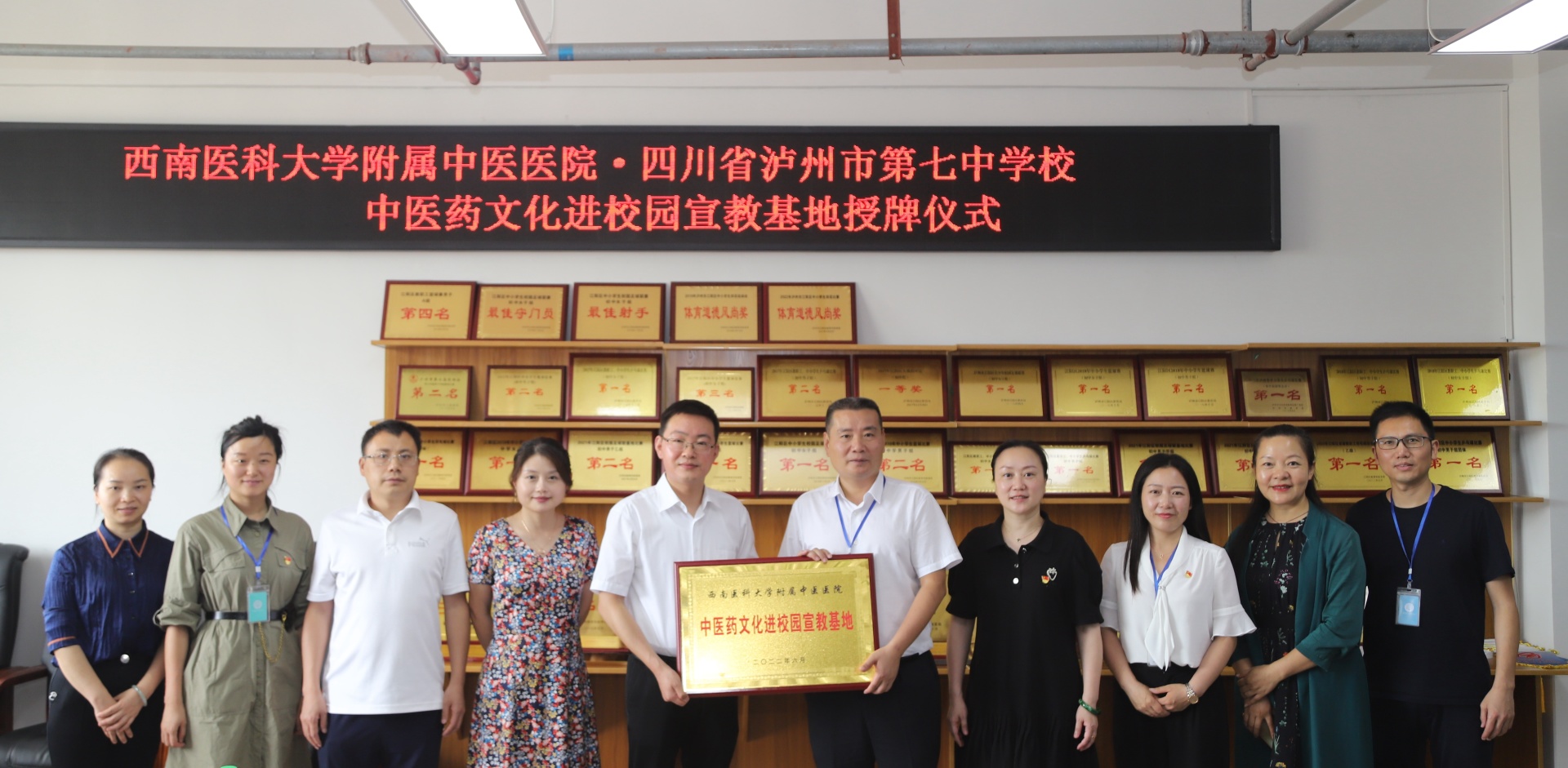 2022年6月7日,我院与泸州市第七中学校举行中医药文化进校园宣教基地授牌仪式。我院副院长徐厚平,泸州市第七中学校党支部书记、校长李强等校领导,我院相关临床科室及职能部门人员等参加了会议。会议由泸州市第七中学校副校长罗文燕主持。