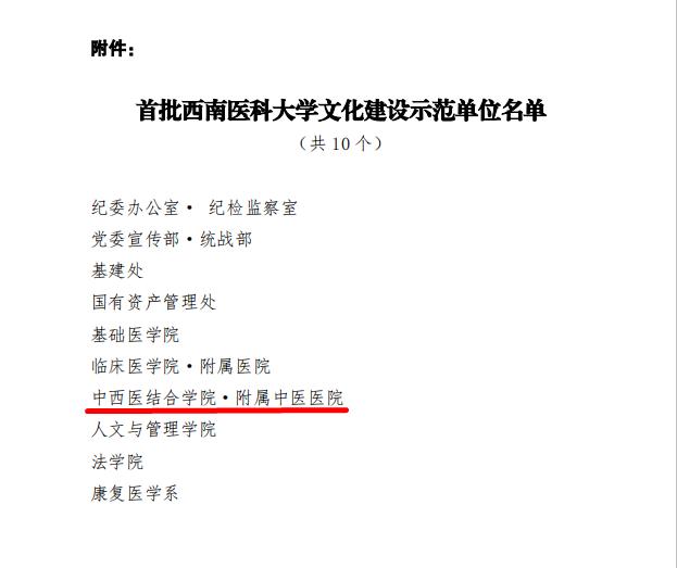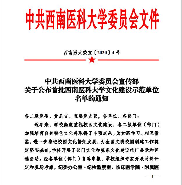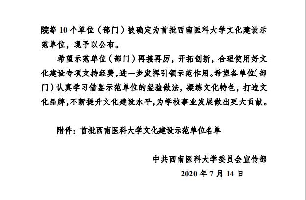 近日,中共西南医科大学委员会宣传部公布首批西南医科大学文化建设示范单位,我院成功获批。