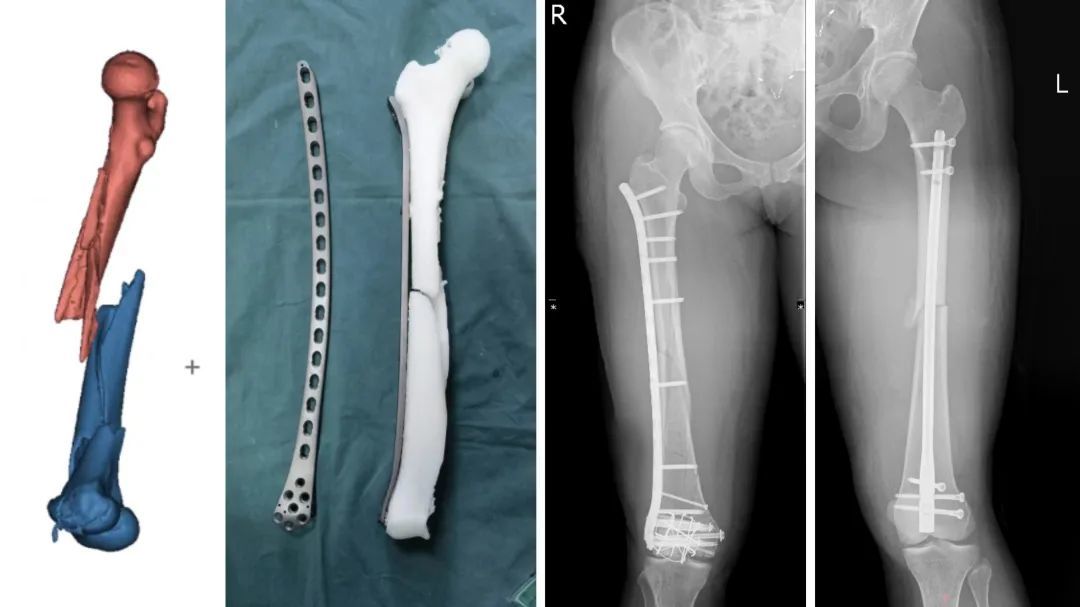 由于患者右侧股骨骨折复杂,粉碎程度严重,常规内置物不能满足此类骨折固定。手术团队应用3D打印技术,提前为伍女士定制内置物,经过10天的康复修养,手术顺利完成。
