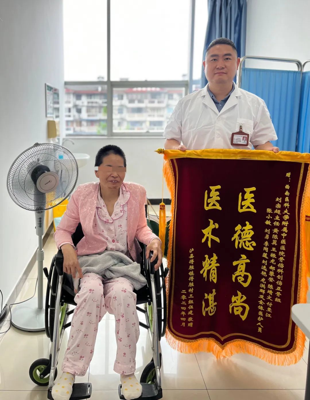 2024年4月16日,遭遇严重车祸后康复出院的伍女士坐着轮椅为西南医科大学附属中医医院骨伤科创伤·正骨组黄陈翼副教授和科室医护人员专程送来一面“医德高尚 艺术精湛”的锦旗,表达感激之情。