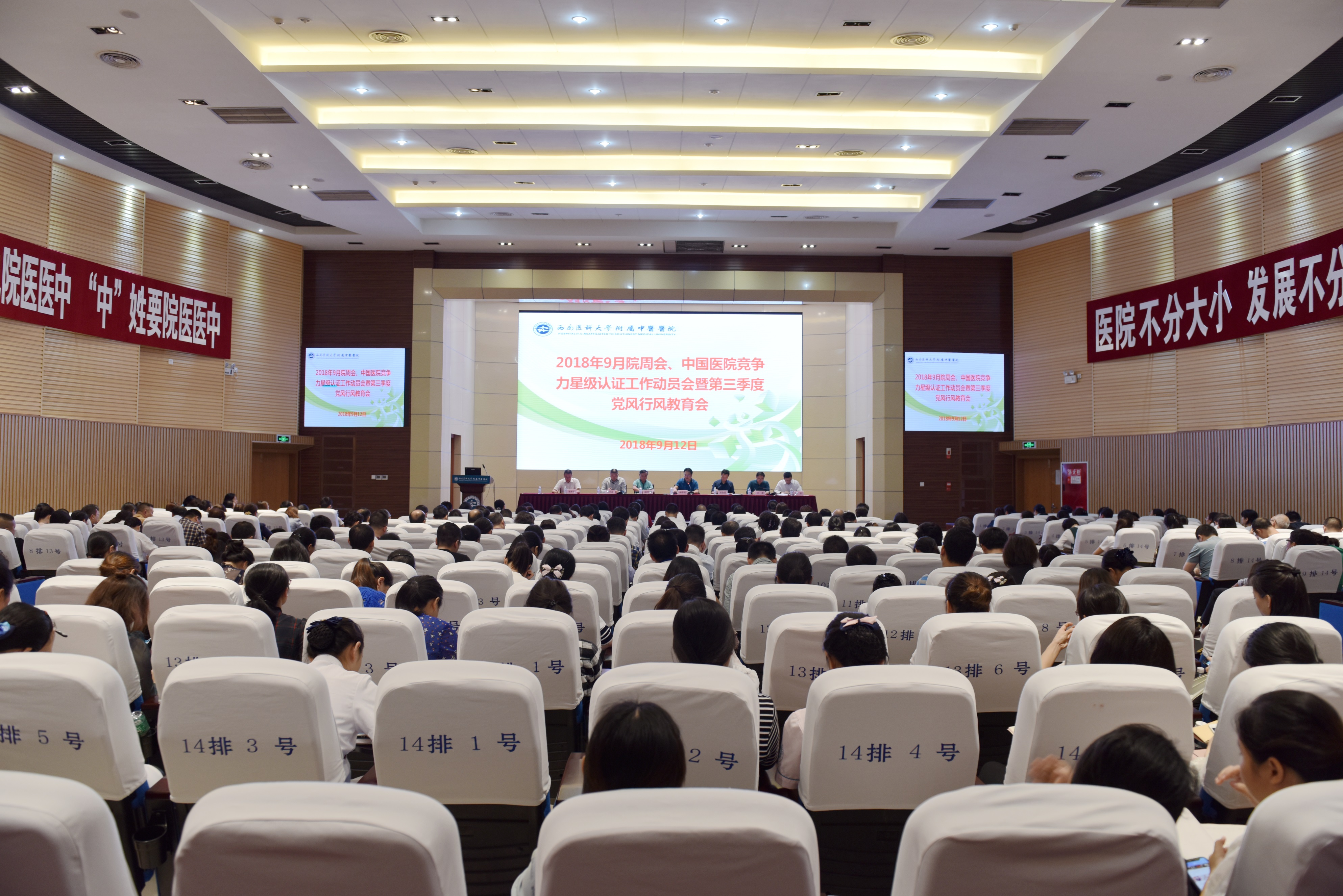9月12日,我院召开2018年第三季度党风行风教育会,在家院领导、科主任、护士长及职能部门负责人共计300余人参加会议。