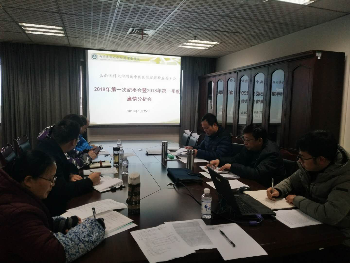 1月25日,我院纪委召开2018年第一次纪委会暨第一季度廉情分析会,医院纪委委员、纪委办全体工作人员参加会议,会议由党委副书记·纪委书记赵国强主持。