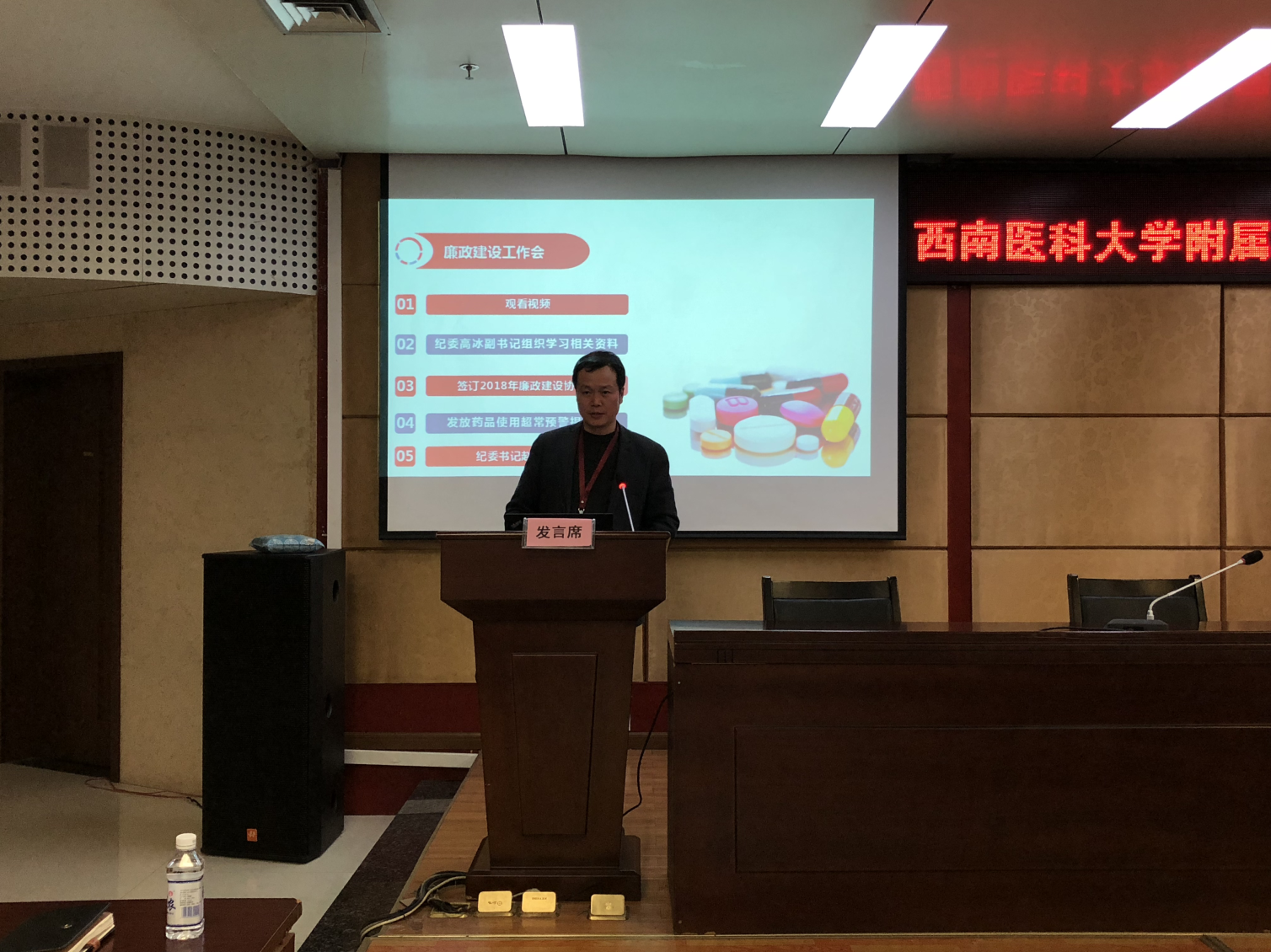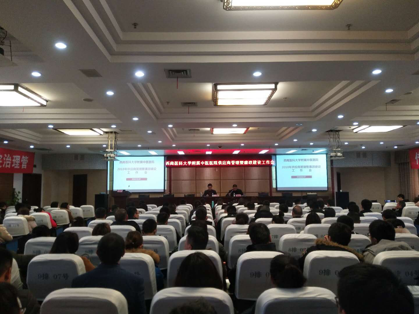 会议现场 会上,医院管理部门负责人分别通报了采购供应管理相关制度、流程及工作情况、医疗器械管理、药品动态监测及配送等院内管理制度执行情况;组织观看了廉洁视频;签订了2018年供应商廉政建设协议书;向2017年用药总金额前5位的中成药和西药10家供应商企业发放了“药品使用超常预警卡”,向在耗材供应过程中存在违规行为的3家供应商发放了“医疗产品廉洁购销警示卡”。