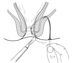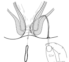 技术特色:切割挂线:用一探针自瘘管外口轻轻向内探人,当探针接近内口时,将另一手指伸人肛管,查探针头,触及探针弯曲,自肛门引出。找到内口后,切开外口至肛管直肠环下方皮肤、皮下组织及部分瘘管,用负压吸引器吸出坏死组织,同时可用刮匙搔刮。在探针尾端缚一橡皮筋,将探针自肛内拉出,并引出橡皮筋,使橡皮筋穿过瘘管,将病变对应处的肛管直肠环用橡皮筋环绕收紧,在靠近皮肤切开处用止血钳同时夹住橡皮筋两端,再在止血钳下方用粗线收紧橡皮筋并双重结扎,拉紧橡皮筋,阻滞气血、经络,使局部组织坏死,从而达到慢切开的治疗,更好的保护括约肌功能的目的。